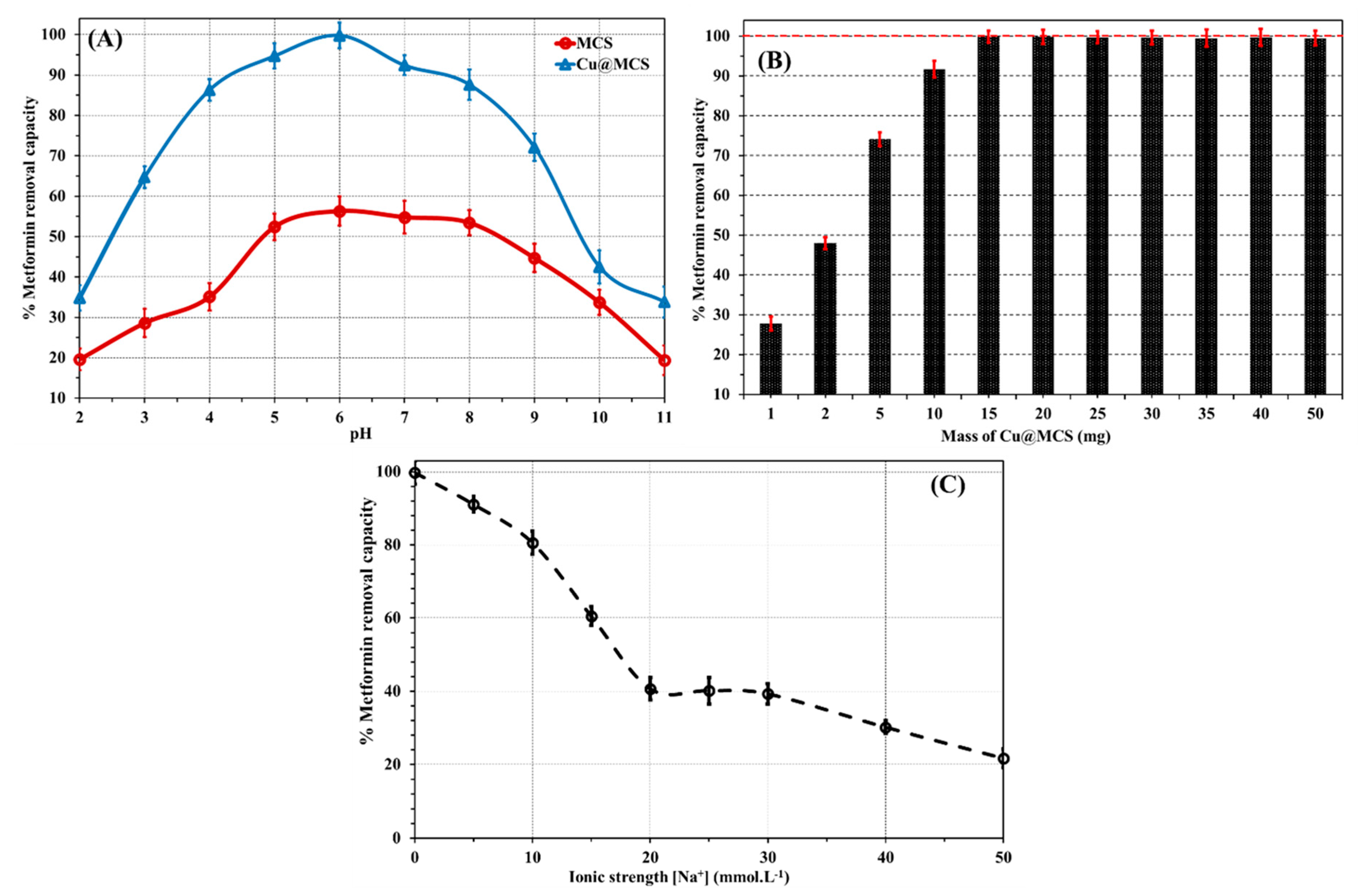 Figure 5. (A) Impact of initial pH, (B) mass dose of Cu@MCS nanocomposite, and (C) solution ionic strength on the removal of metformin at the optimum conditions (initial metformin concentration is 20 mg L−1; T = 298.15 K; nanocomposite dosage is 15 mg, mean ± standard deviation, n = 3).