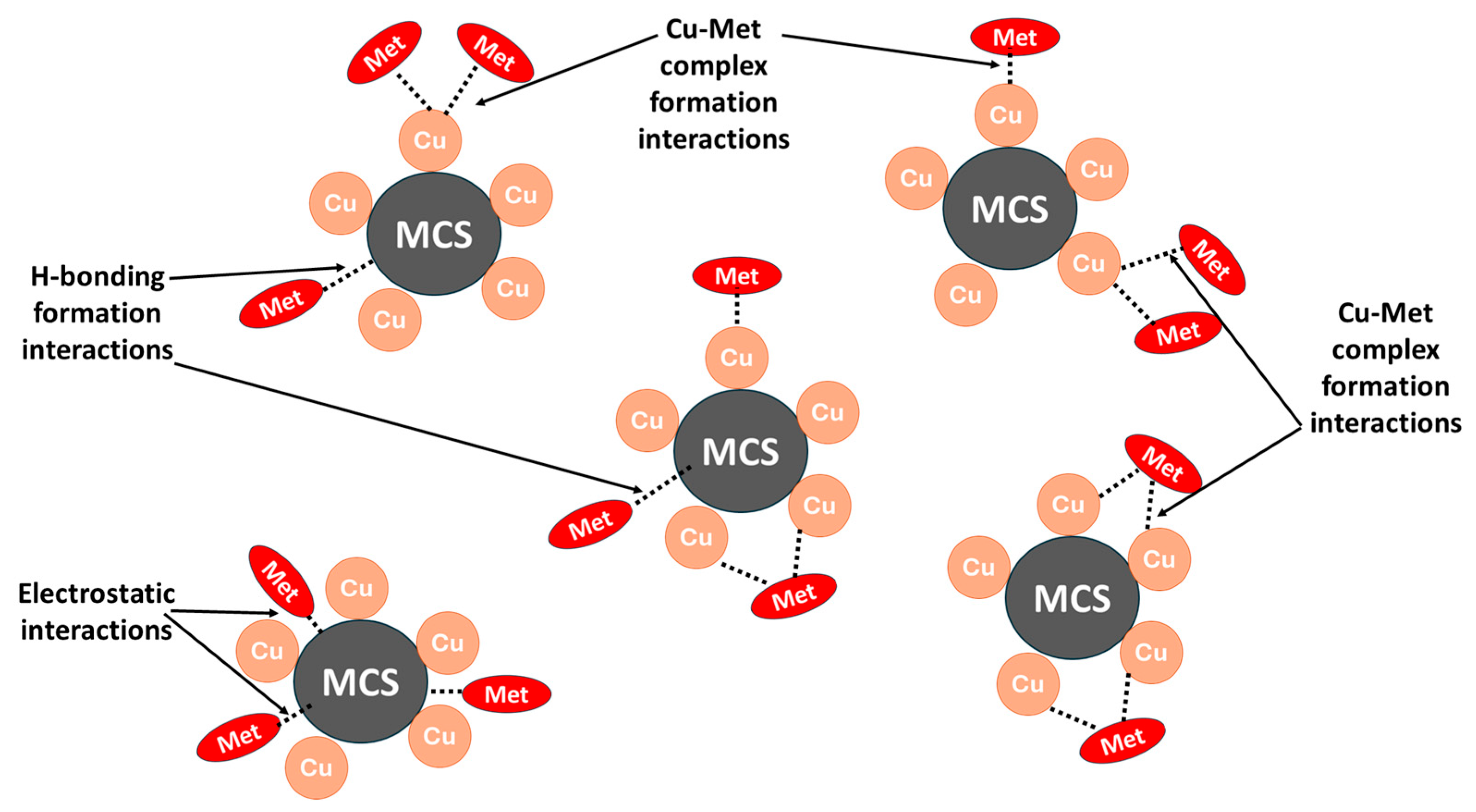 The sorption of metformin and Cu@MCS can be described using four distinct types of interactions, depending on the pH of the solution [74,75]. In the first, Cu-NPs bind with the two free imine (-C=NH) groups to form stable five-membered chelate rings, as well as bind with the free amino group to form Cu–metformin surface complexes. In addition, the Cu-NPs prevent the MCS moiety from being aggregated, which significantly affects the surface area of the Cu@MCS and, in turn, enhances the metformin removal capacity. The investigations in Section 3.3 prove that the primary interactions between the Cu-MCS and the metformin are the surface Cu-complex formation [76]. The second method is the hydrophobic interaction between the two methyl groups on the 3°-N-atom of metformin with the magnetite in MCS. The third one has to do with the H-bonding that forms between the MCS’s several oxygen-containing groups (hydroxyl groups of CS and negatively charged oxygen atoms of magnetite) and the N-functional groups in metformin. The fourth method involves electrostatic interactions, which are variable with the solution pH. These interactions are mostly brought on by the attraction between the positively charged protonated nitrogen groups of metformin and the negatively charged groups in the MCS [75,77,78]. Certainly, the immobilization of Cu-NPs in the Cu@MCS nanocomposite has a crucial advantage for improving metformin’s adsorptive removal. Figure 7 presents a schematic illustration of the proposed interactions between metformin and the Cu@MCS nanocomposite.