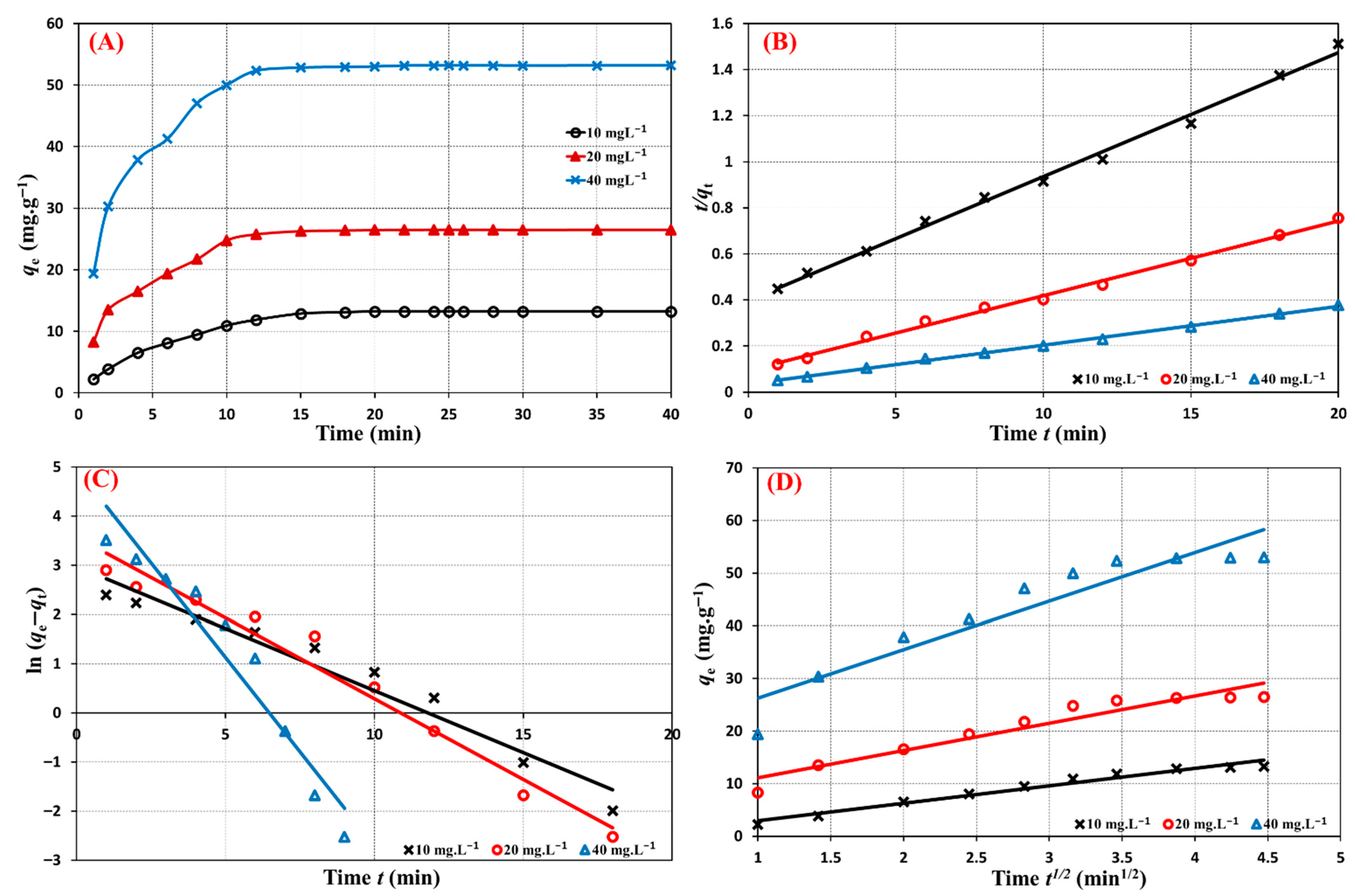 Figure 8. Contact time effect (A), PSO (B), PFO (C), and intraparticle (D) kinetic models for metformin adsorption removal by Cu@MCS nanocomposite for different initial concentrations (10, 20, 40 mg·L−1) at 298 K.