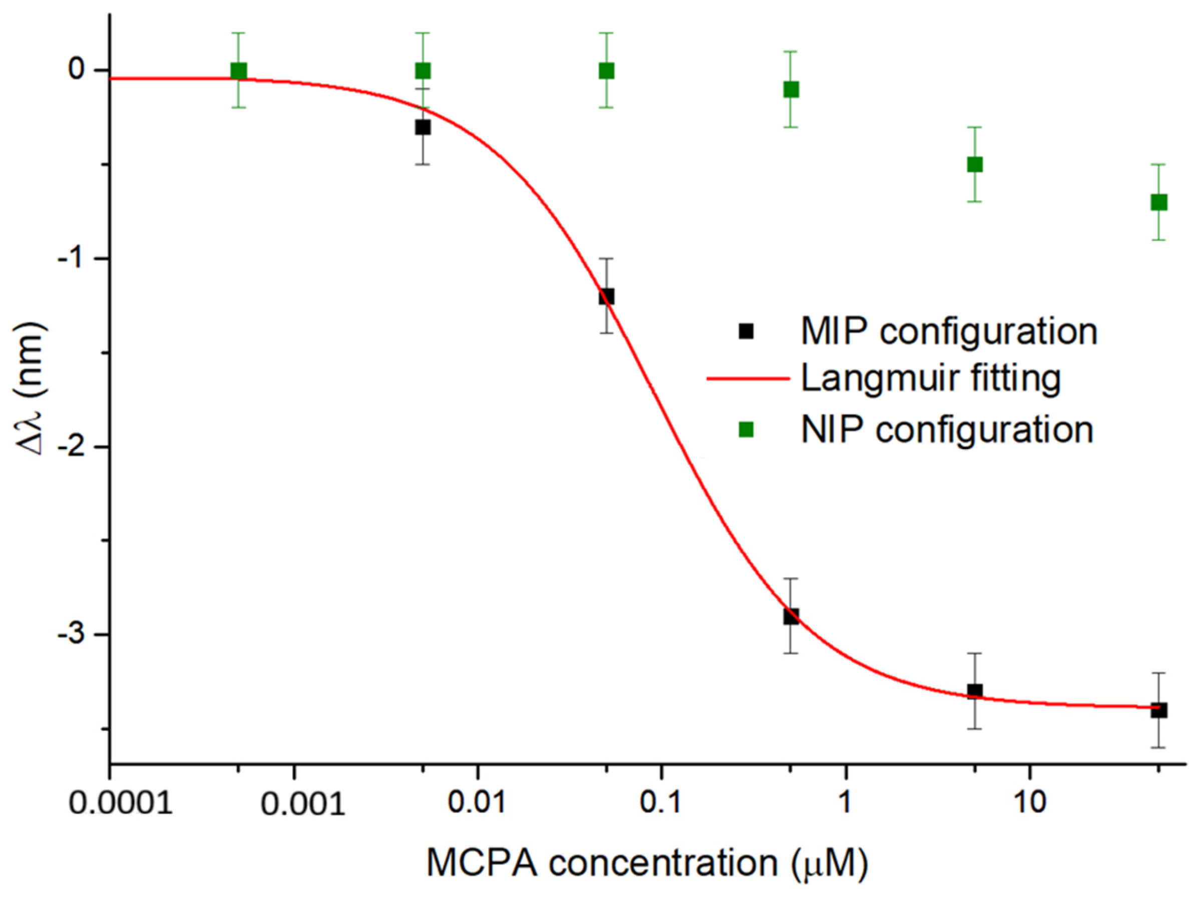 - Tavoletta, I.; Alberti, G.; Arcadio, F.; Zeni, L.; Cennamo, N. Two Sensors Based on Molecularly Imprinted Polymers and Plastic Optical Fibers for Fast and Cost-Effective MCPA Herbicide Detection in Environmental Monitoring. Talanta 2025, 298, 128842. [Google Scholar] [CrossRef]
