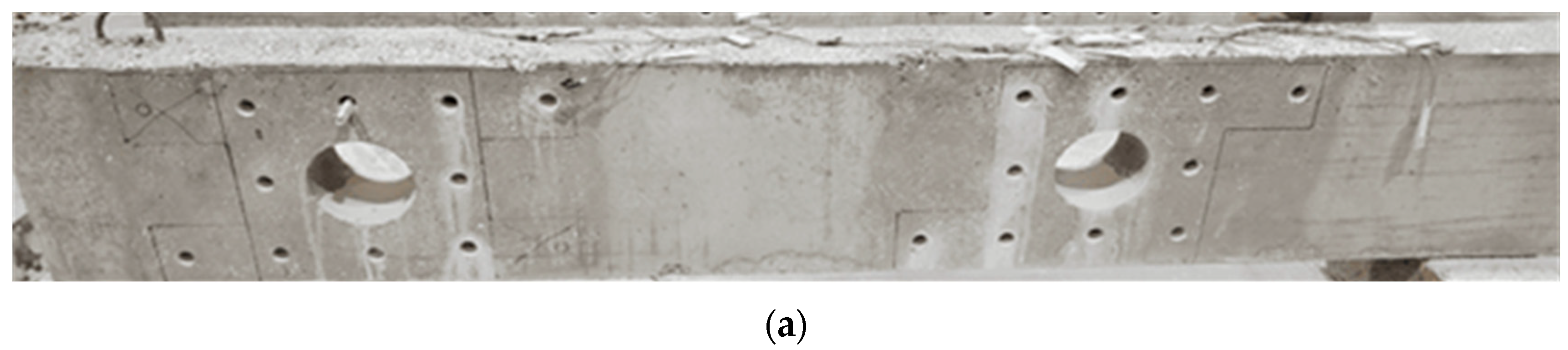 - Farouk, M.A.; Moubarak, A.M.; Ibrahim, A.; Elwardany, H. New alternative techniques for strengthening deep beams with circular and rectangular openings. Case Stud. Constr. Mater. 2023, 19, e02288. [Google Scholar] [CrossRef]