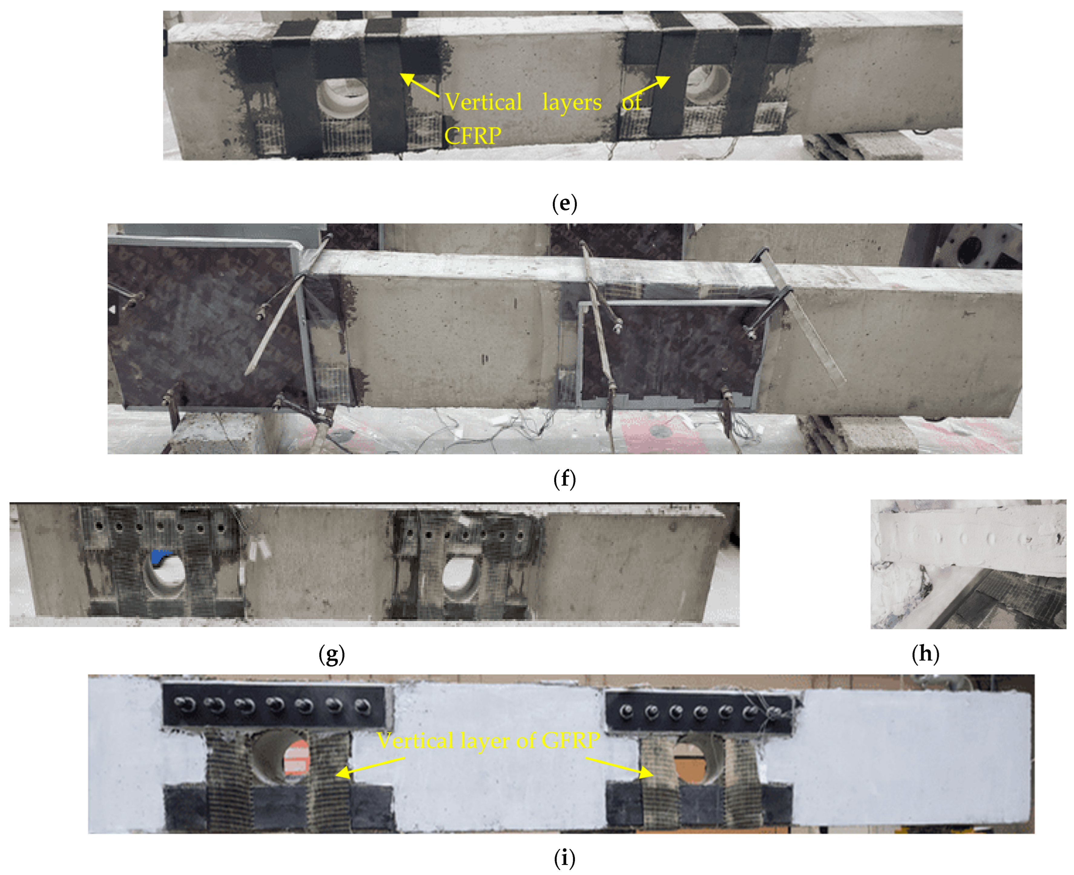 - Khalaf, M.R.; Al-Ahmed, A.H.A.; Allawi, A.A.; El-Zohairy, A. Strengthening of continuous reinforced concrete deep beams with large openings using CFRP strips. Materials 2021, 14, 3119. [Google Scholar] [CrossRef] [PubMed]