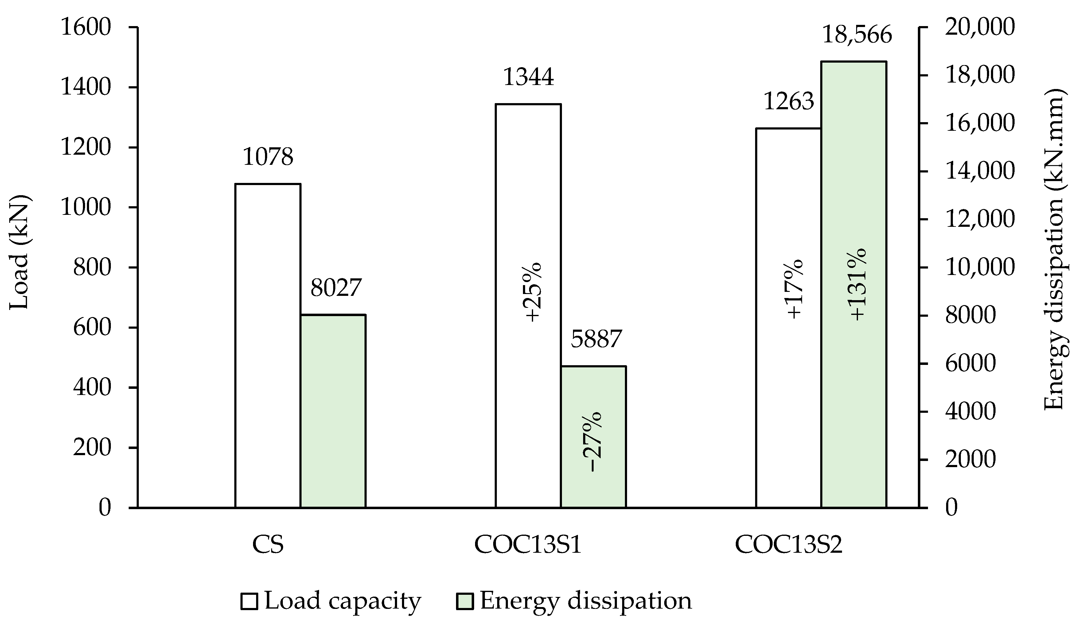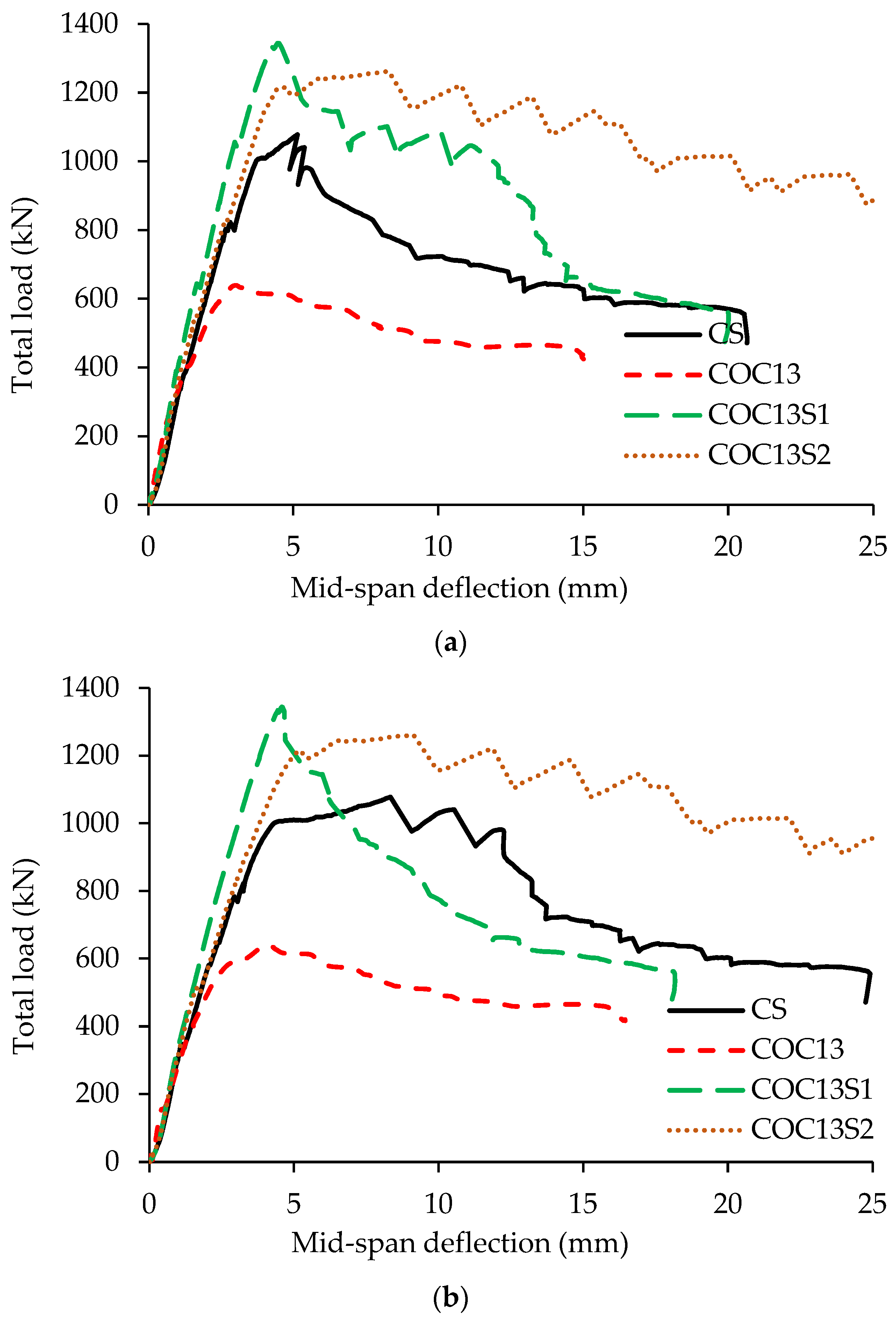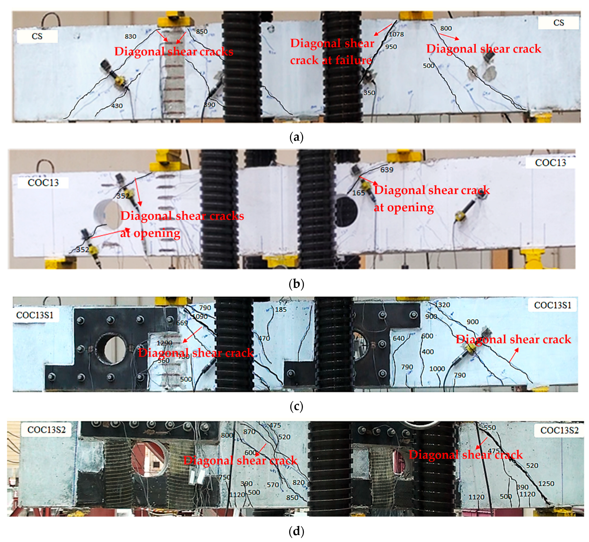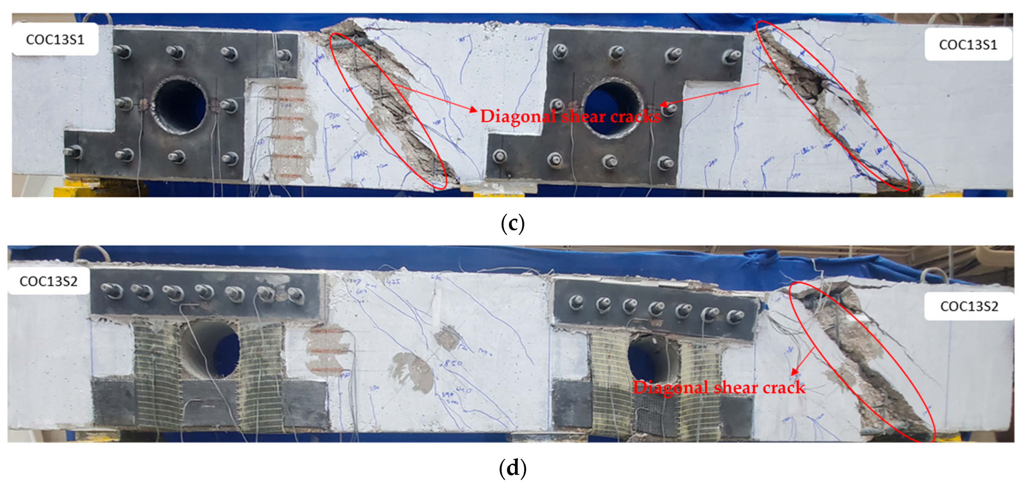 - For the beam having circular openings strengthened using steel plates (COC13S1), the load capacity reached 125% compared to the reference solid beam, resulting in a remarkable 110% increase in beam strength compared to the unstrengthened specimen COC13. Similarly, for the beam strengthened using a hybrid FRP/steel plates system (COC13S2), the load capacity reached 117% compared to the reference solid beam, resulting in a load enhancement by 98% compared to the beam with circular openings COC13.