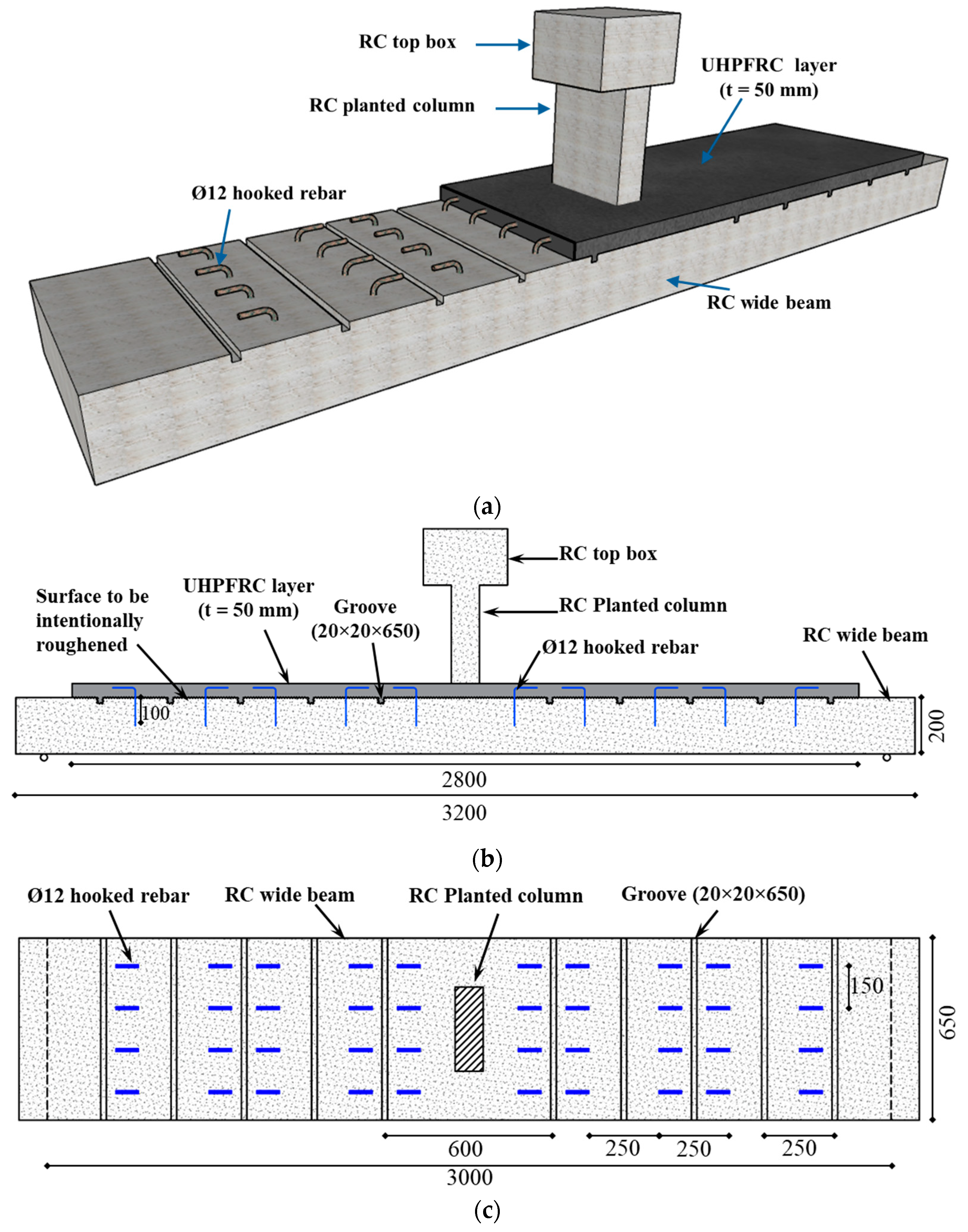 For the strengthened beam S-UHC, transverse grooves measuring 20 × 20 mm were created on the specimen’s top surface to enhance the mechanical interlock between the UHPFRC overlay and the specimen. After that, the hole locations for the 12 mm diameter hooked rebars were marked and drilled. The rebars were then inserted into the predrilled holes, with a 100 mm embedment length into the existing concrete. The void around the rebars and surrounding concrete was filled with adhesive mortar (SIKA 31/41) to ensure a secure bond. These rebars were hooked into the UHPFRC layer to further strengthen its bond with the beam. Once the epoxy mortar was fully cured, formwork was installed to accommodate casting of the UHPFRC overlay. The UHPFRC mix was fabricated in the laboratory, and it was subsequently cast onto the top face of the wide beam. Figure 4 provides details of the retrofitted specimen, while Figure 8 presents the strengthening process.
