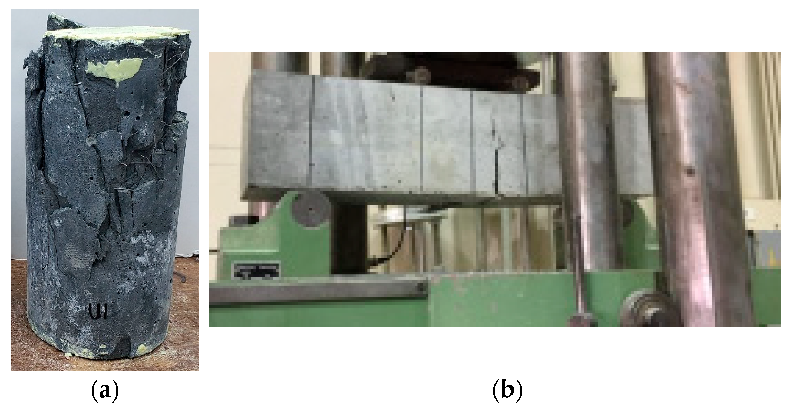 The other strengthening material utilized in this investigation was UHPFRC, designed to achieve a compressive strength of 120 MPa. Table 4 outlines the mix proportions of the UHPFRC used. Standard specimens (prisms and cylinders) were prepared to assess their mechanical characteristics, as presented in Figure 6. The strength of UHPFRC in both flexure and compression was evaluated as per ASTM standards [37,39], and the findings are presented in Table 3. UHPFRC layer, 50 mm in thickness, was placed in the compression zone of the beam to enhance its performance. To enhance the bond at the interface between UHPFRC and the original surface, the top side of the specimen was purposefully roughened. Furthermore, 12 mm diameter hooked steel rebars were embedded into the beam to provide additional anchorage, as depicted in Figure 4.