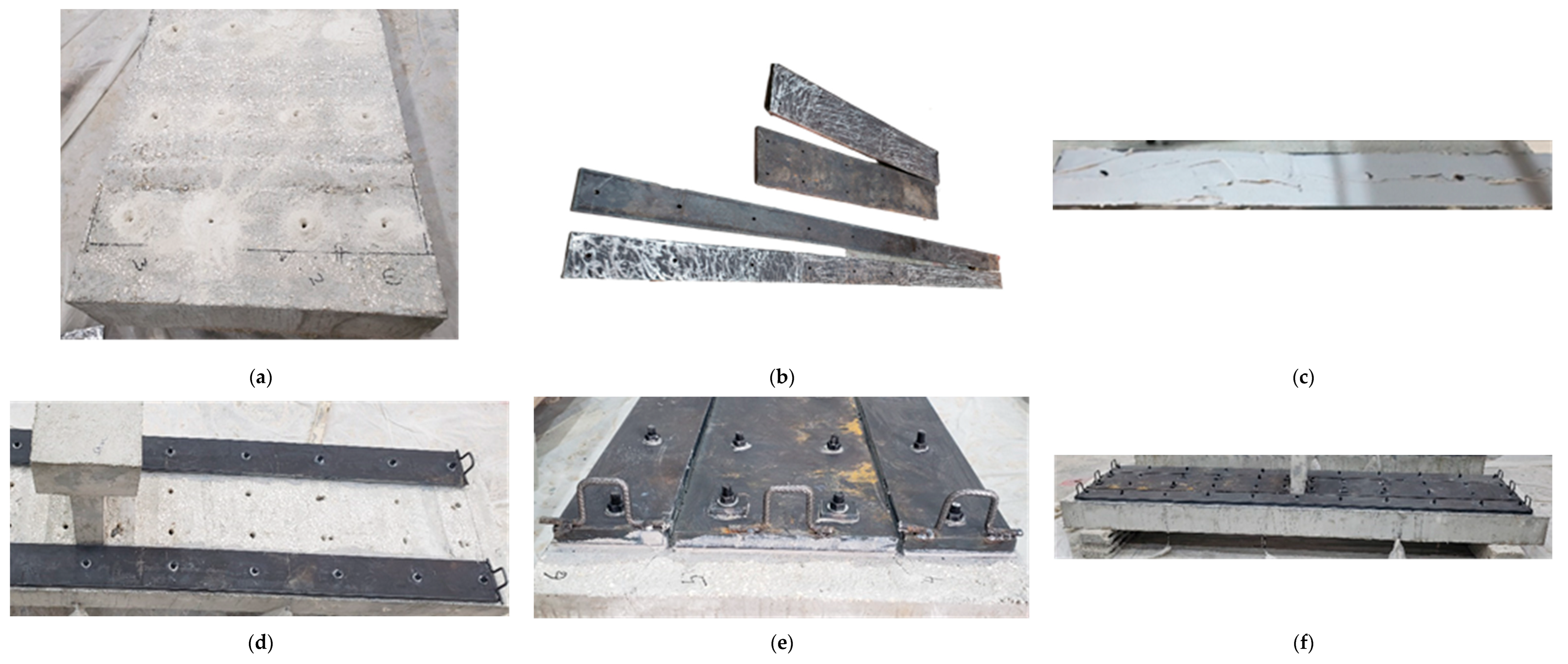 For the strengthened specimen S-SP, the hole locations were first marked on the beam and then drilled. High-strength steel rods having a 14-mm diameter were inserted in the drilled holes. To achieve full bonding, the annular space between the rods and the surrounding concrete was filled with polymer adhesive (SIKA 31/41). Corresponding holes were also drilled into the steel plates to align with the installed rods. The steel plates were then positioned over the threaded rods and pressed firmly against the concrete surface. To improve the bond at the interaction of plates and concrete, the interface surface of the plates was intentionally roughened. Adhesive mortar (SIKA 31/41) was applied to the underside of the plates to fill any voids and ensure full contact with the concrete surface. Pressure was applied to the plates until epoxy began to extrude from the interface, indicating adequate adhesion. Finally, the nuts were tightened on the threaded rods to secure the steel plates to the top surface of the beam. The configuration of the strengthened specimen is shown in Figure 3, while the strengthening procedure is illustrated in Figure 7.