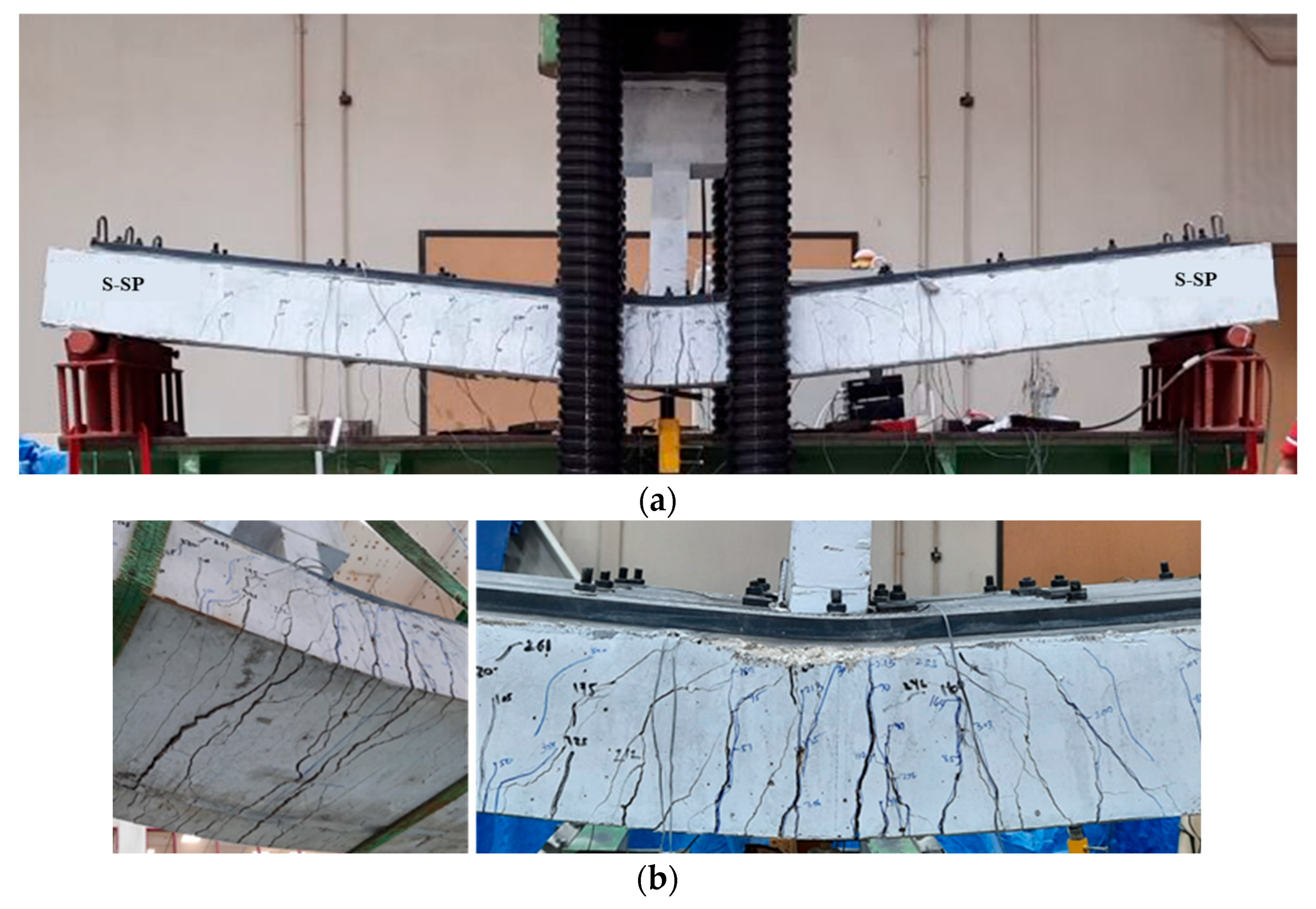 The strengthened beam S-SP exhibited a flexural mode of failure. The first major flexural crack appeared near the mid-span, as presented in Figure 12. When the load increased, a corresponding increase in deflection was noticed. Flexural cracking progressed further on the tension side, concentrated around the middle zone. Eventually, failure was noticed in the bottom concrete following the yielding of the tensile reinforcement. Importantly, no localized failure, such as concrete splitting or pull-out, was observed around the anchoring rods, confirming that the anchorage system was not a limiting factor in the failure. This sequence confirms a typical flexural failure mechanism characterized by post-yield deformation prior to ultimate failure.