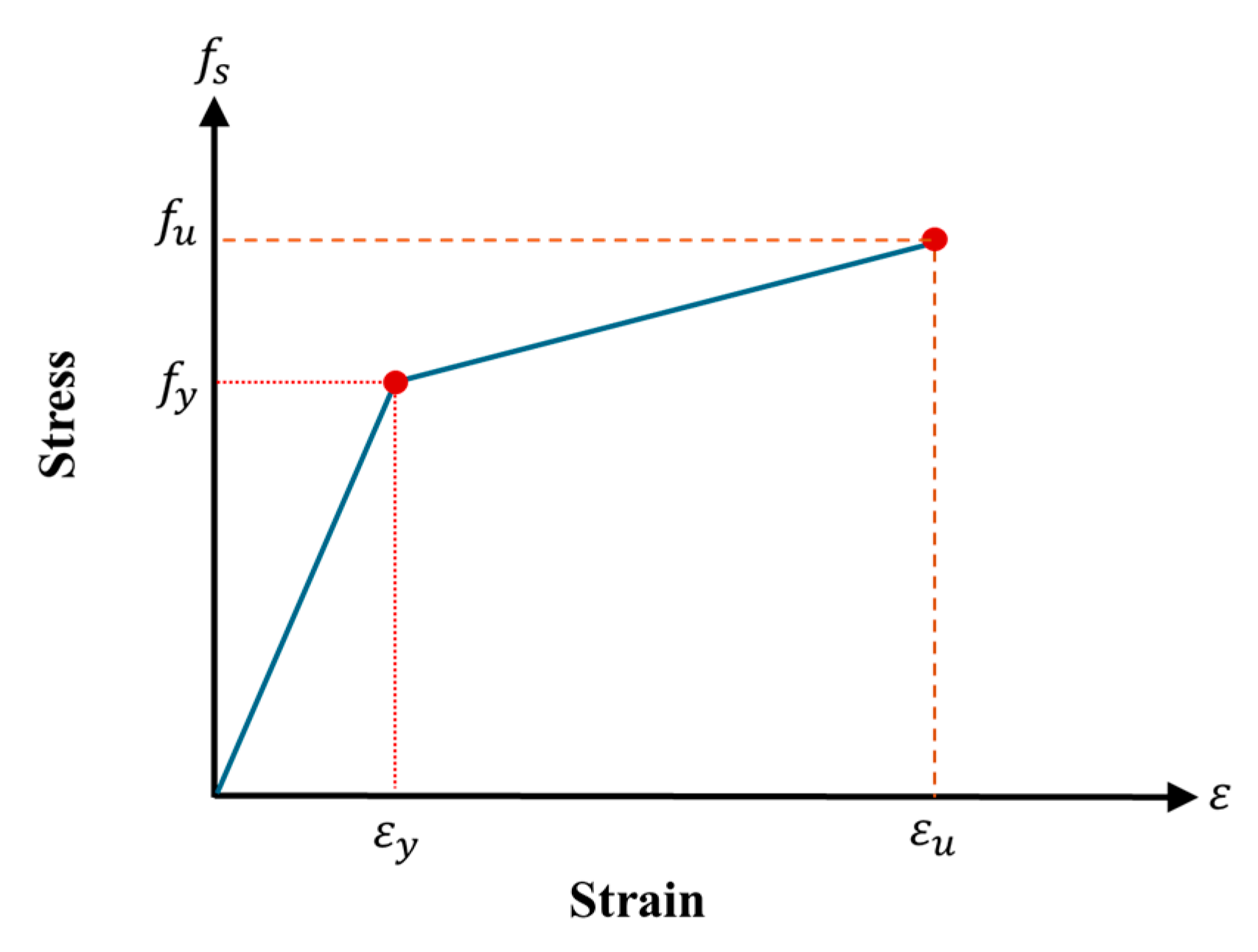 With the help of the laminar analysis approach, the shallow beam section was subdivided into several thin layers, as depicted in Figure 17. Stress calculations for each layer were performed using Mander’s model [40] for normal concrete and Naeimi’s model [41] for UHPFRC. The stresses in the steel plates, as well as in the tensile and compressive reinforcement, were evaluated utilizing a bilinear stress–strain model, illustrated in Figure 18.