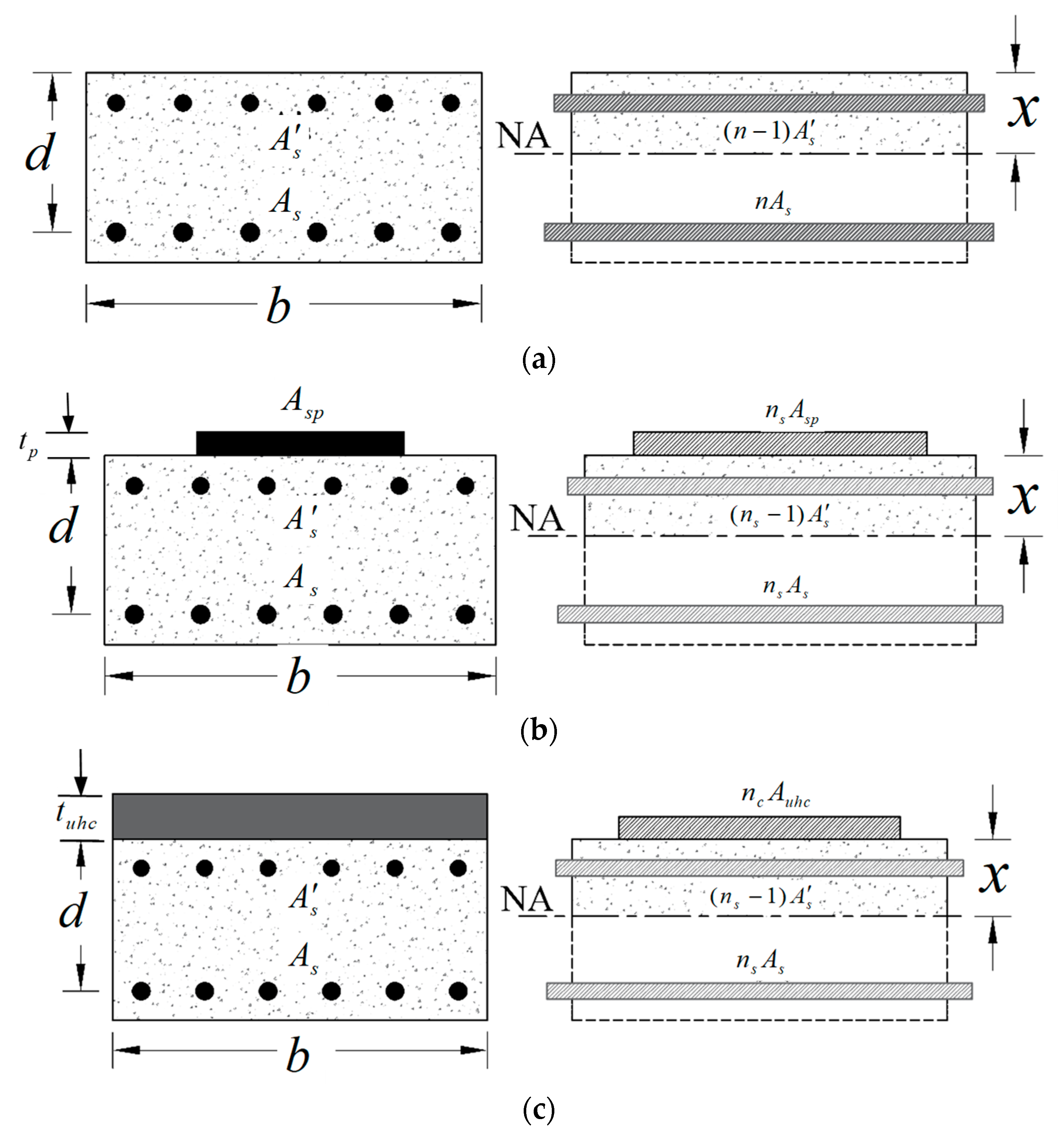 where ε c i is the strain in each normal concrete layer; ε u h c i is the strain in each UHPFRC layer; ε s   &   ε s are the strain in tensile and compression reinforcement, respectively; d c i is the distance from the neutral axis to the concrete layer; d u h c i is the distance from the neutral axis to the UHPFRC layer; d is the distance from the center of tension bars to the beam top fiber; d is the distance from the center of compression bars to the extreme compression fiber; and c is neutral axis depth.