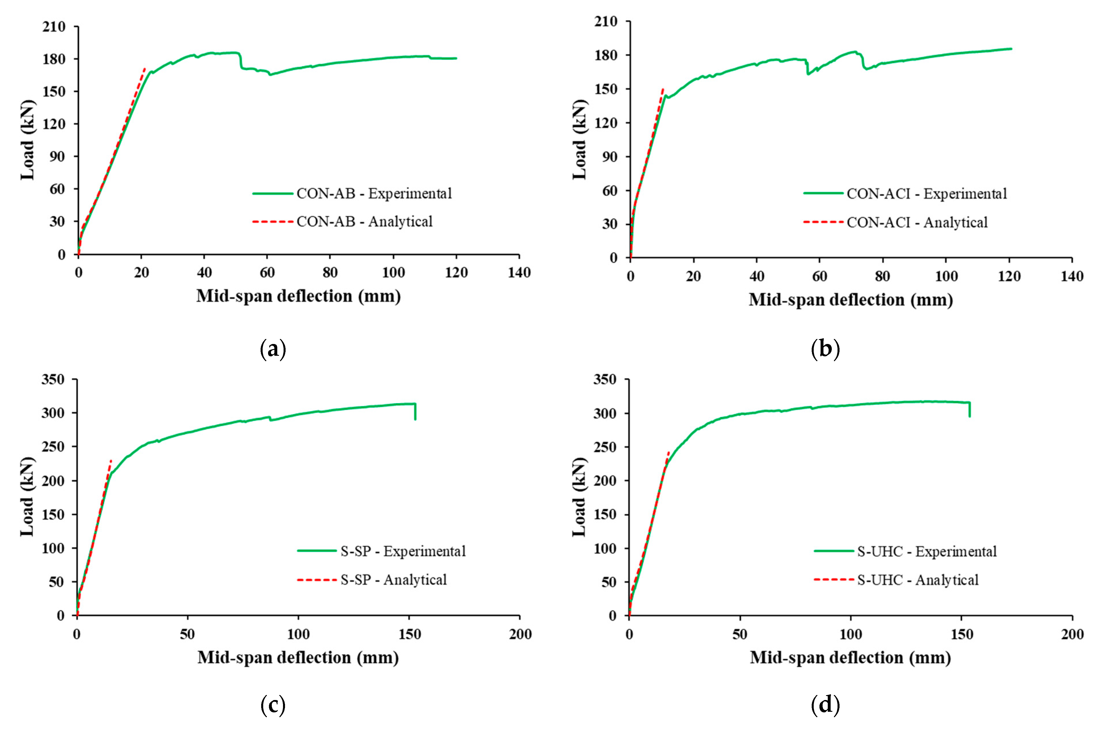 Figure 20. Comparison of measured and predicted load–deflection plots for: (a) CON-AB; (b) CON-ACI; (c) S-SP; (d) S-UHC.