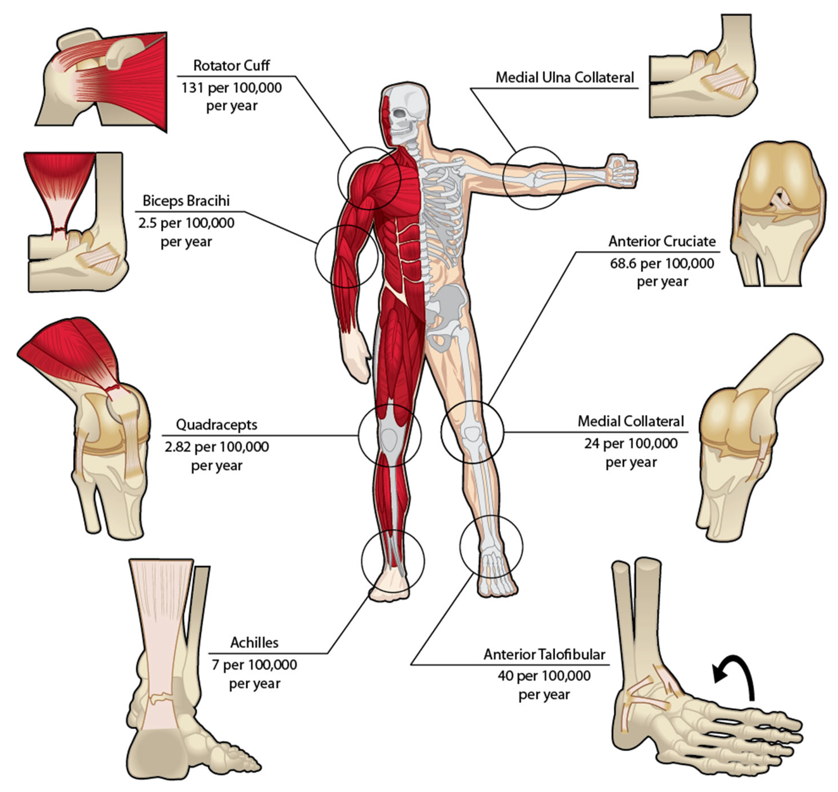 Tendon and ligament (T/L) injuries span many conditions, from minor sprains to complete tears, and are a significant and growing health concern, considerably impacting affected individuals and the broader healthcare system [1]. Tendon and ligament injuries are responsible for ~1/3 of all musculoskeletal consultations, with an annual incidence of four million worldwide. In the United States alone, the annual surgeries related to these injuries exceed 300,000 [2] (Figure 1) These figures highlight the growing number of T/L injuries, the possible complications that may arise from these injuries, and the extensive rehabilitation required to recover. Past research on T/L injuries provided valuable insights into T/L biological and mechanical properties. This knowledge has translated into advances in both surgical and conservative treatments for T/L injuries [2]. Despite these advances, T/L injuries remain a persistent clinical challenge [1]. The broader implications of these injuries manifest as decreased work productivity, extended physical therapy sessions, and the emotional challenges of managing reduced mobility and/or chronic discomfort [1].