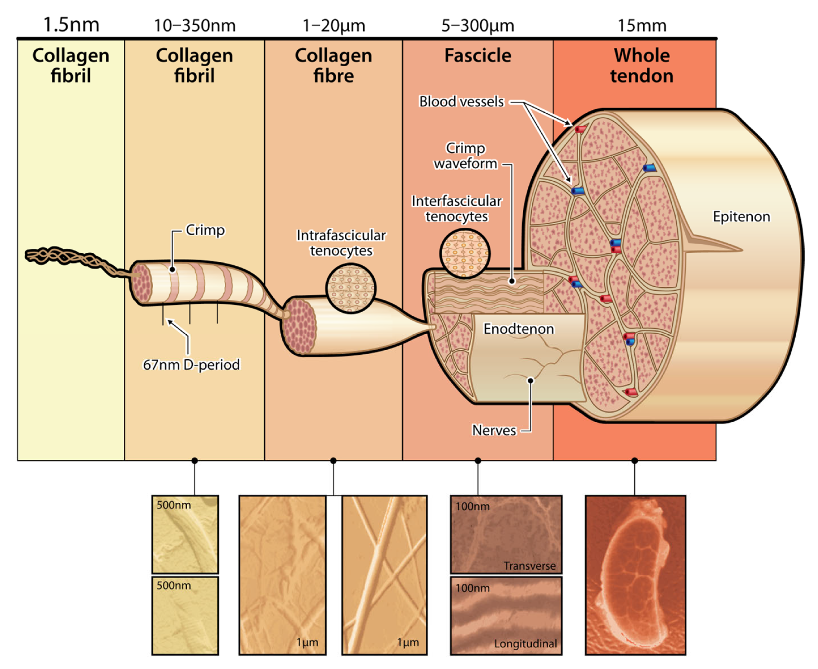 Figure 2. Hierarchical structure of tendon, from collagen fibrils to the whole tendon, demonstrating how organization supports high load resistance.