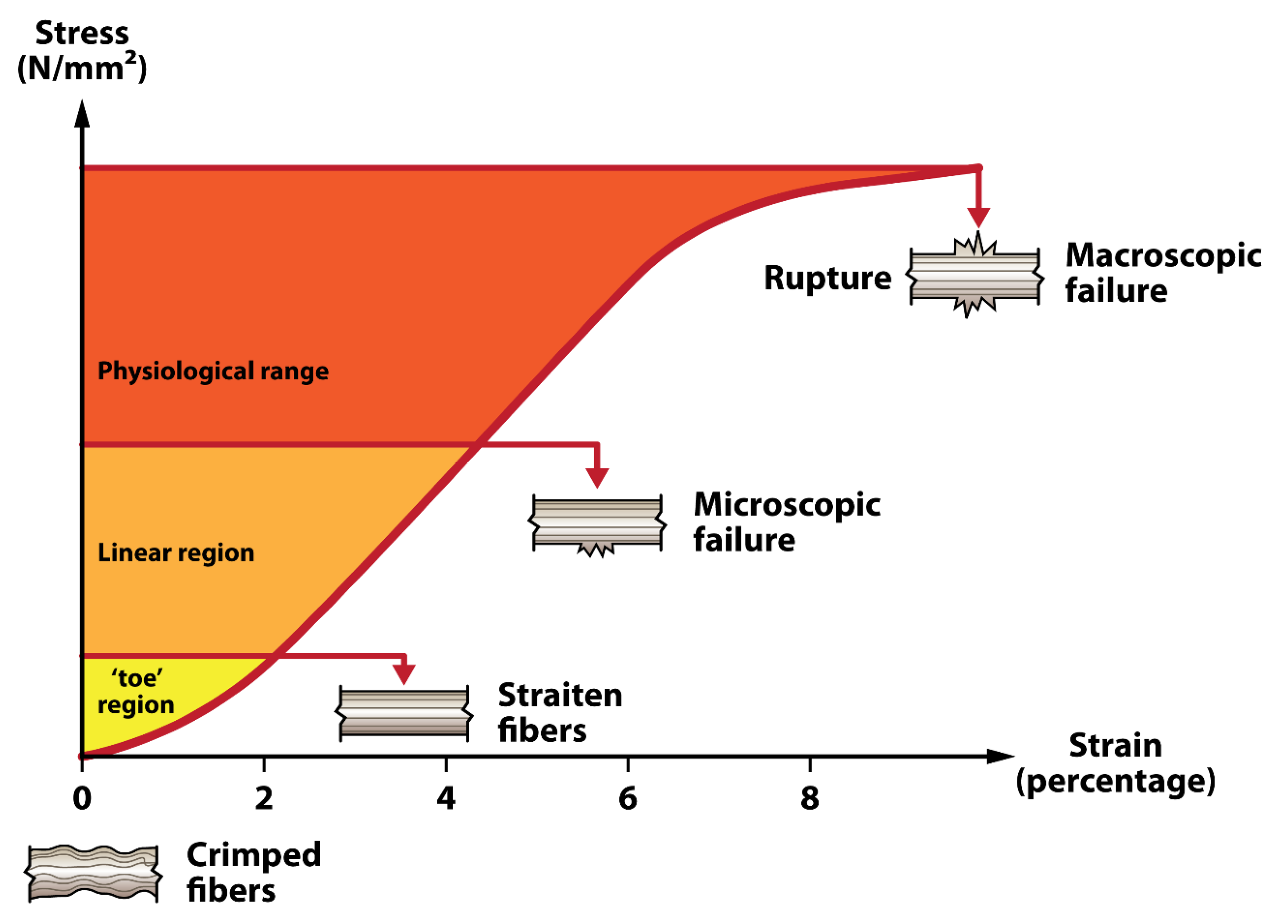 Figure 3. Tendon stress–strain curve illustrating the different phases of tendon deformation. The curve consists of three primary regions: the toe region, where crimped fibers begin to straighten; the linear region, where fibers align and tensile stiffness increases; and the physiological range, which includes both the toe and linear regions and represents normal functional loading. Beyond this range, microscopic failure occurs as individual fibers begin to rupture, followed by macroscopic failure and complete tendon rupture at higher strains. The diagram visually represents these phases with color coding, highlighting the progressive nature of tendon damage under increasing strain.