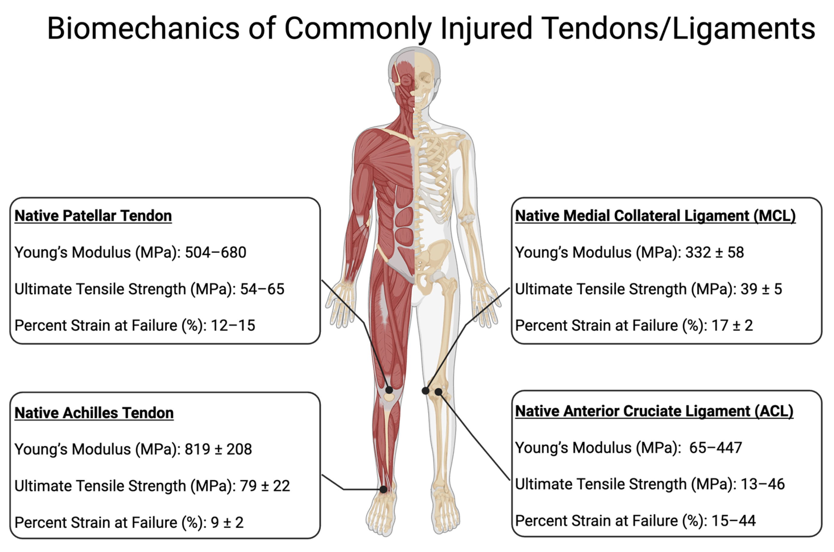 Figure 4. Native biomechanical properties of commonly injured tendons and ligaments. Comparison of the native mechanical properties of the patellar tendon, Achilles tendon, anterior cruciate ligament (ACL), and medial collateral ligament (MCL). Young’s modulus represents the tendon or ligament’s stiffness and its ability to resist deformation under load. Ultimate tensile strength (UTS) indicates the maximum stress the tissue can withstand before failure. Percent strain at failure reflects the tissue’s capacity to elongate before rupture. These parameters provide insight into the functional mechanical behavior of these tissues in the human body.