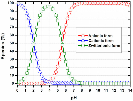 According to our findings, at pH values close to 1.0, MSZ molecules are predominantly in the cationic form, with the amine group fully protonated. At a pH of around 4.0, the zwitterionic form prevails, characterized by the simultaneous protonation of the amine group and ionization of the carboxyl group. At pH 6, approximately 50% of the zwitterionic species coexist with 50% of the anionic species. At a pH greater than pH 7.0, most molecules are in the anionic form, resulting from the predominant ionization of the carboxylic group (Figure 2) [39].