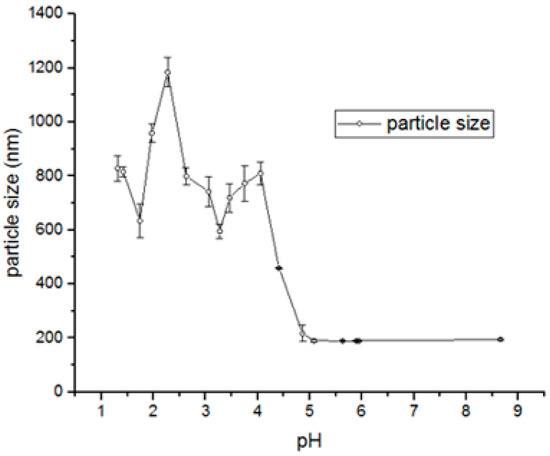 Using the experimental approach, complexes obtained under acidic conditions (pH 1.98–3.27) displayed larger sizes, ranging from 644 to 1153 nm. At pH values above 5.0, precipitated particles were consistently around~200 nm. MSZ is highly soluble under strongly acidic (pH~1.0) or alkaline (pH > 7.0) conditions. Within the intermediate pH range, solubility decreases, leading to particle precipitation (Figure 4).