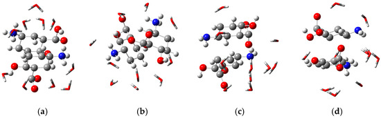 Interaction between mesalazine species and water molecules in a medium with the dielectric constant of water—3D. (a) Cationic; (b) zwitterionic; (c) anionic; (d) zwitterionic/anionic.
