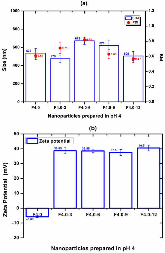 Effect of CS incorporation in MSZ-NPs prepared at a pH of 4.0: (a) Size (bar), PDI (circ), and (b) zeta potential (bar). Each point represents the mean ± SD of three experiments (n = 3). Nanoparticles without CS (F4.0), nanoparticles with 3% CS (F4.0-3), nanoparticles with 6% CS (F4.0-6), nanoparticles with 9% CS (F4.0-9), nanoparticles with 12% CS (F4.0-12).