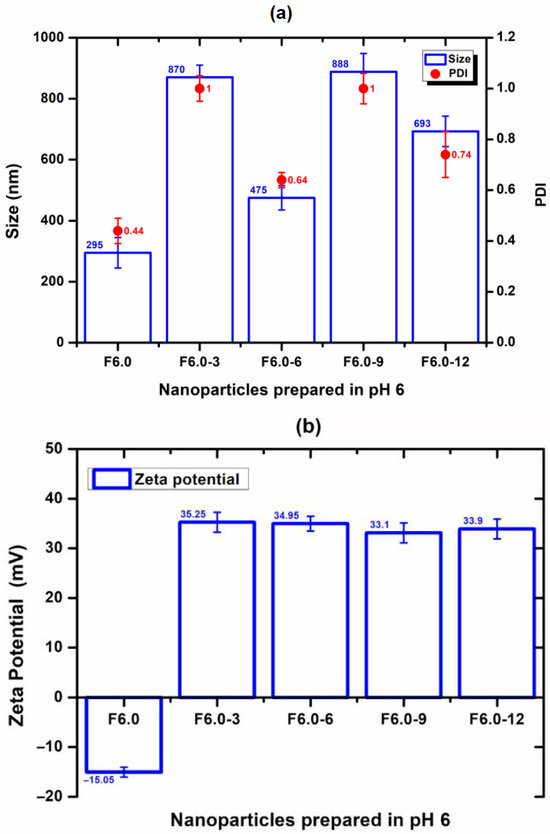The nanoparticle prepared at a pH of 1.5 (F1.5) was excluded from this study due to its positive zeta potential, which does not favor interaction with CS and has a positive charge. For F4.0, nanoparticles prepared at a pH of 4.0, the effect of CS concentration on particle size, PDI, and zeta potential was evaluated and is shown in Figure 6. The incorporation of 3% to F4.0 and F4.0-3 resulted in the smallest particle size (Figure 6). The PDI values for the formulation with CS were like those observed with F4.0 (Figure 6). While F4.0 exhibited a negative zeta potential (−5.83 mV), the addition of CS promoted charge inversion, suggesting the adsorption of CS molecules on the surface of MSZ-NPs (Figure 6). The F6.0 formulation prepared at a pH of 6.0 exhibited a zeta potential of −15.05 mV. Upon CS incorporation, a charge inversion was also observed (Figure 7). The samples containing 6% of CS F6.0-6) exhibited the smallest particle size and the lowest PDI, suggesting that CS interacted with the particle surface in a more organized manner, leading to a more compact structure. The higher CS proportion required for F6.0 compared to F4.0 is likely due to the greater number of ionized carboxylic groups present on the F6.0 nanoparticles.