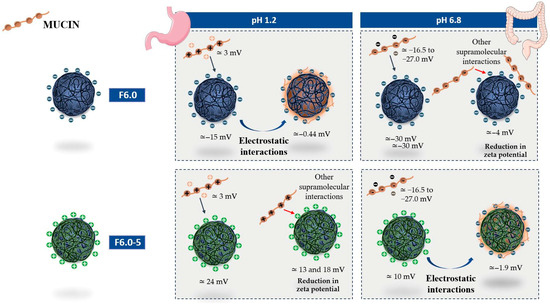 Schematic illustration of the interaction of mucin with MSZ nanoparticles, without chitosan (F6.0) and with CS (F6.0-5), at pH 1.2, simulating gastric pH, and at pH 6.8, simulating enteric pH, based on the results presented in Table 7.