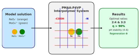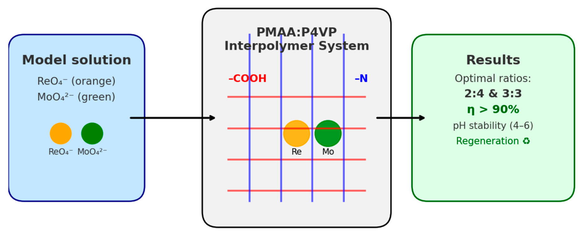 Conventional extraction methods—pyrometallurgical, solvent extraction, and precipitation—require aggressive reagents and high energy consumption, generating large volumes of waste [9,10,11,12,13,14]. In contrast, polymeric and interpolymer sorbents offer mild operating conditions, tunable selectivity, and structural stability [15,16,17,18,19,20,21,22,23,24,25,26,27,28]. Their technical efficiency and limitations are summarized in Table A1 (Appendix A). Among them, interpolymer systems (IPS) formed by weak polyacids and polybases exhibit unique cooperative effects: mutual activation alters the degree of ionization, modifies polymer conformation, and creates new adsorption centers capable of donor–acceptor interactions with metal oxyanions [28,29,30,31,32]. Despite the progress achieved, the mechanisms governing the selective binding of rhenium and molybdenum in such systems remain insufficiently clarified. Most studies have examined either Re(VII) or Mo(VI) separately [8,28,31], neglecting the competitive sorption and the relationship between interpolymer composition, structure, and kinetics. Furthermore, few works have compared equilibrium models for describing oxyanion sorption on heterogeneous polymer matrices.