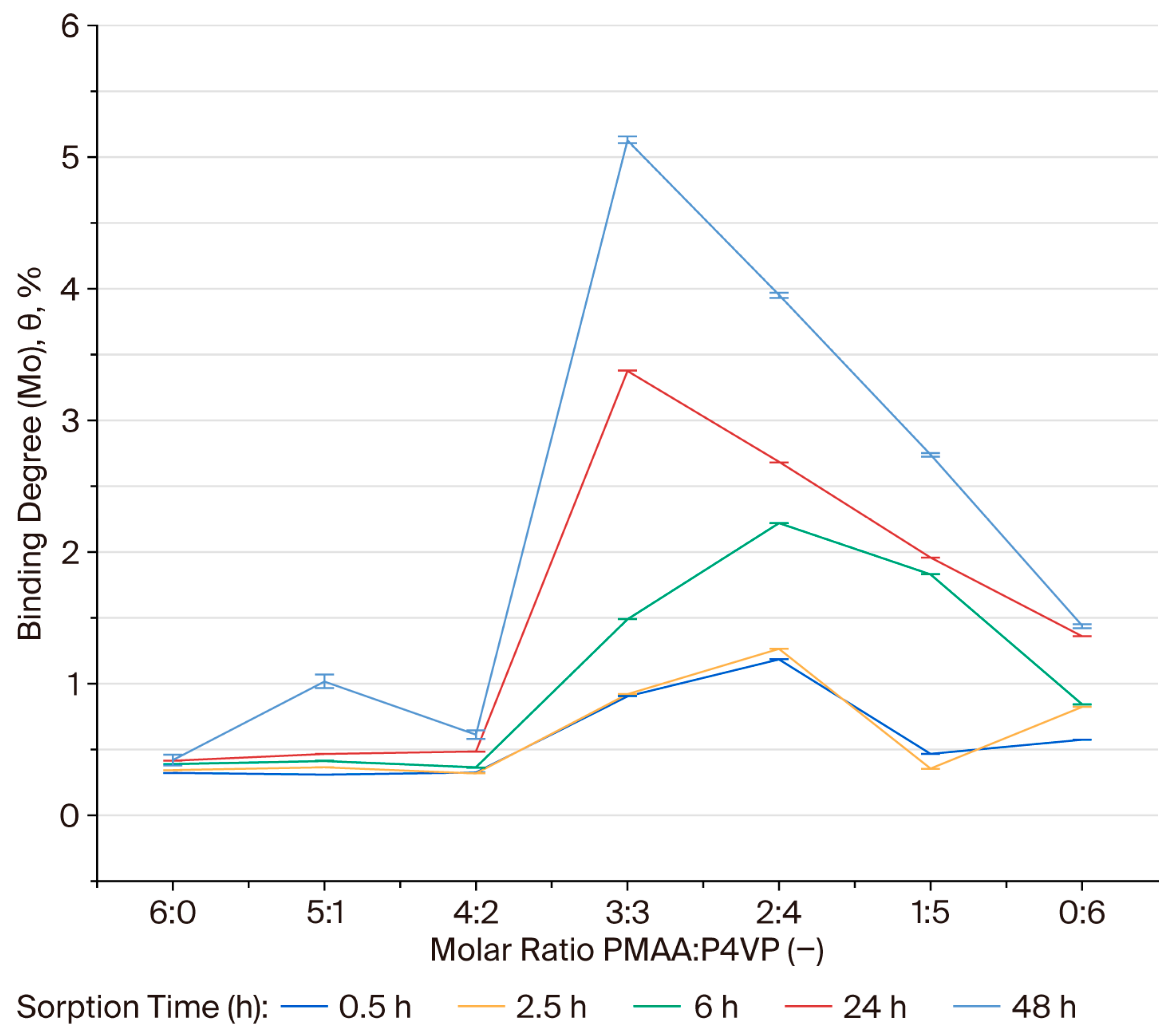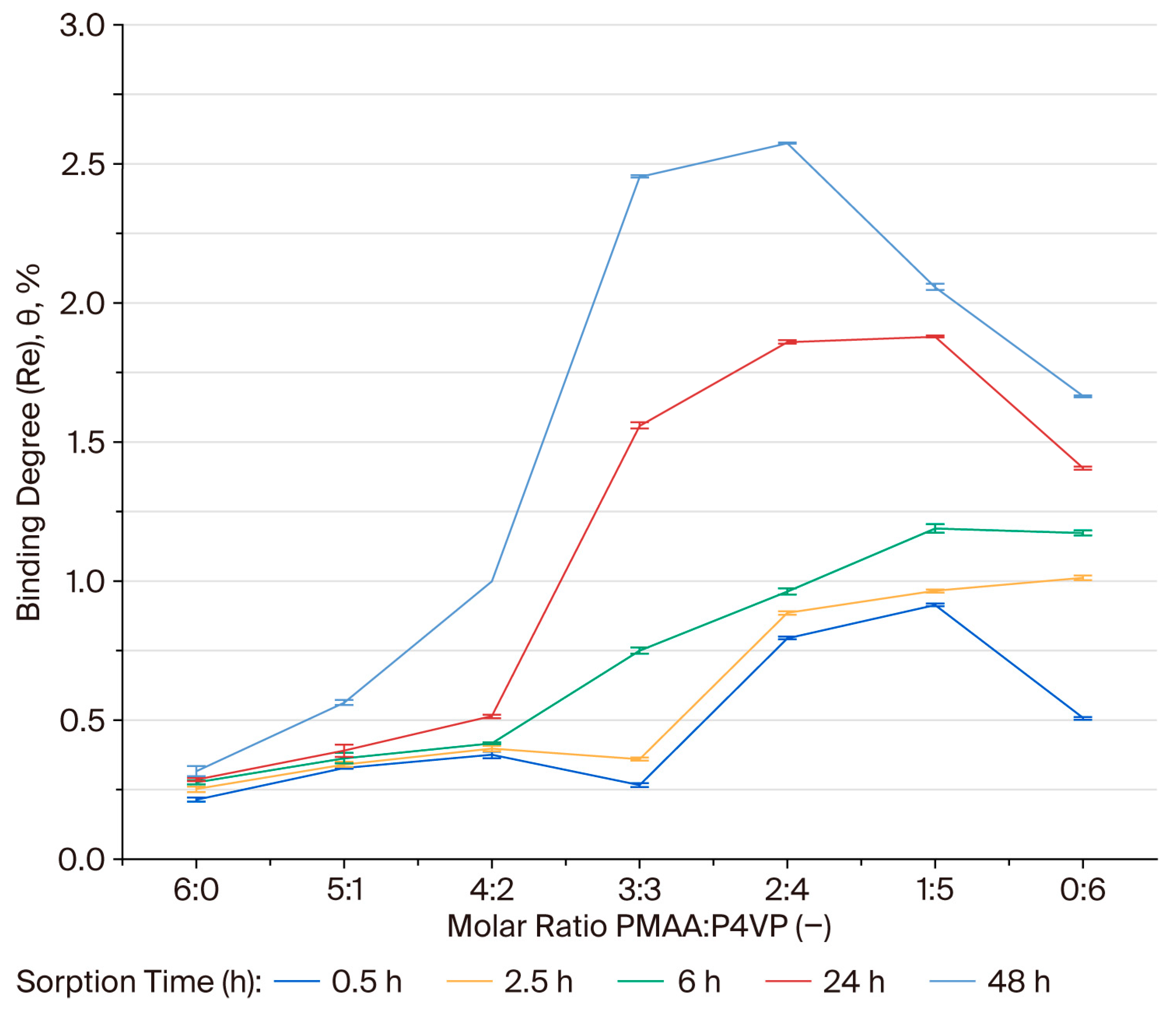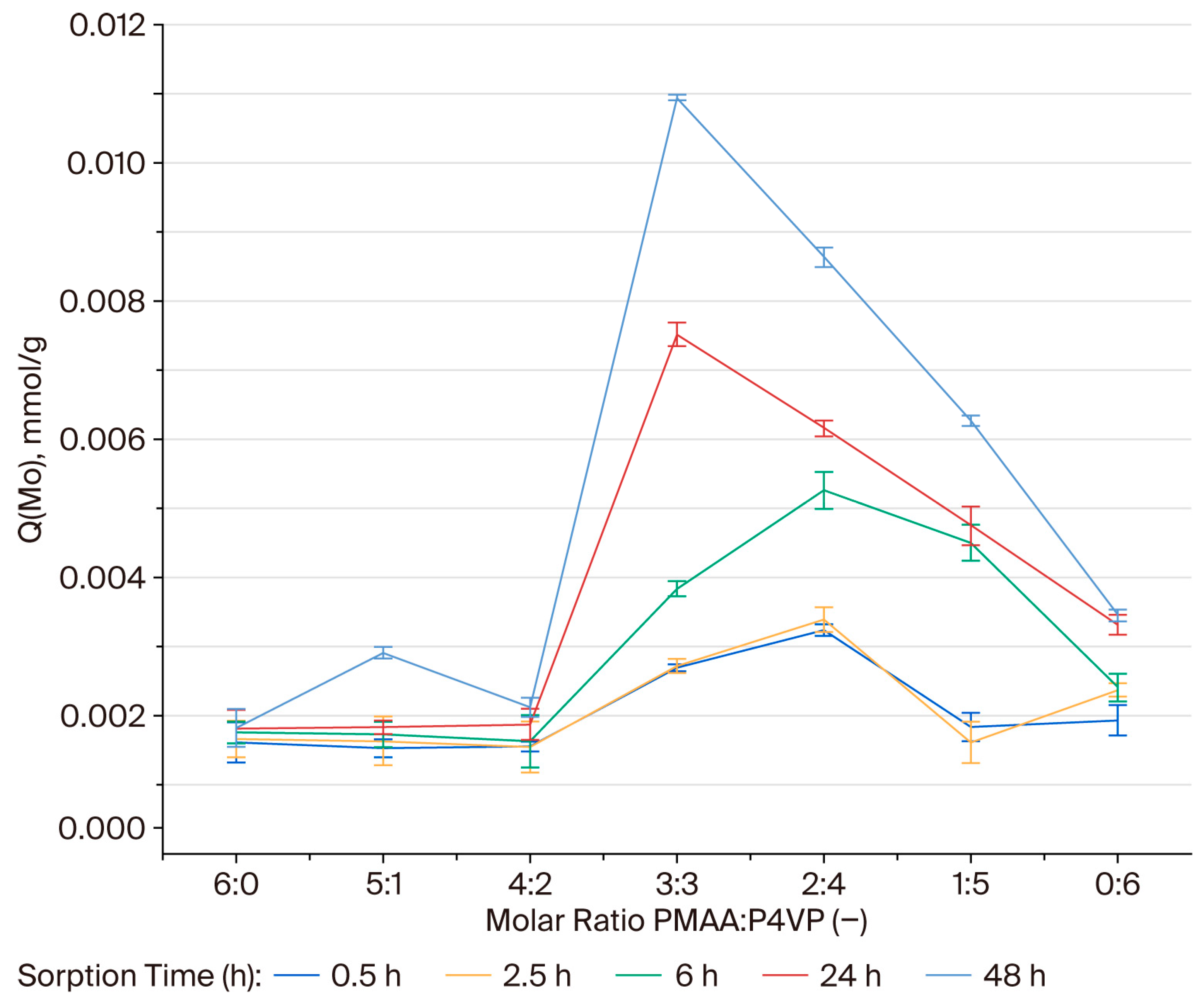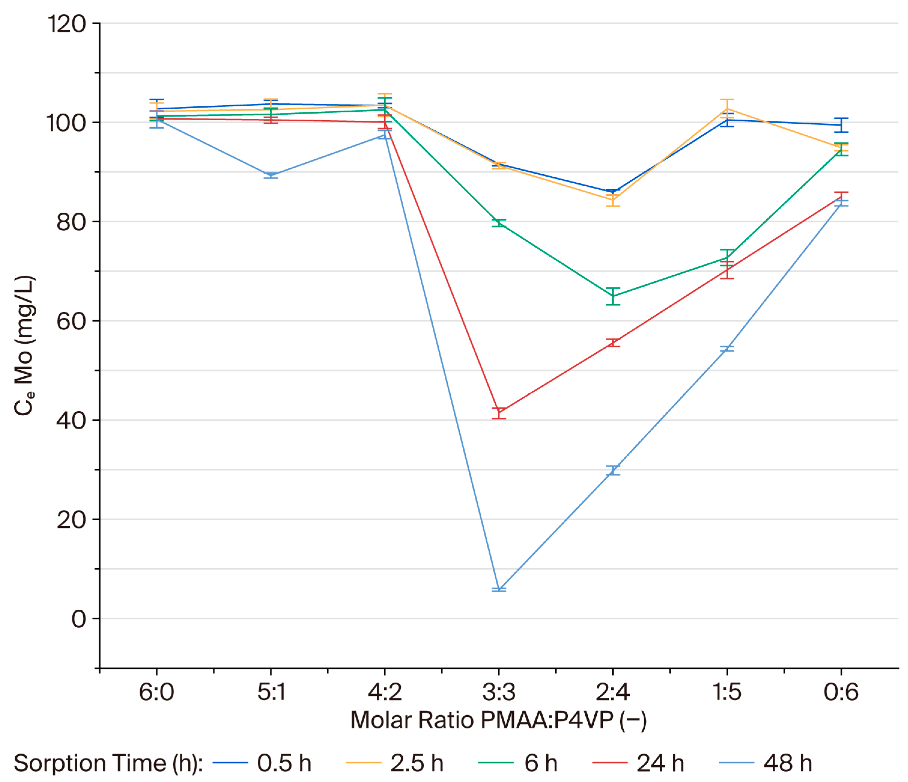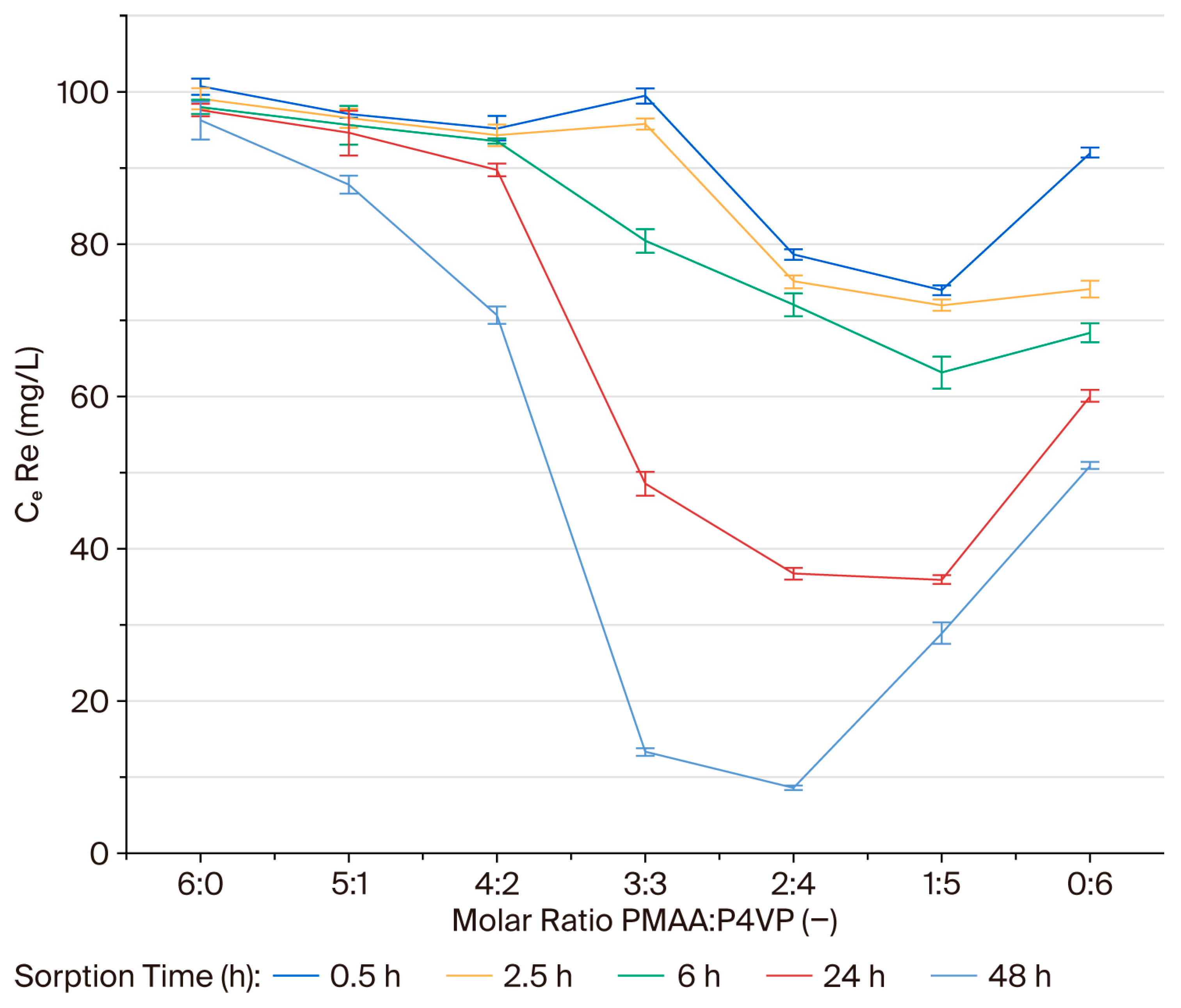 Figure 11. Desorption of rhenium (Re) and molybdenum MoO42− ions from PMAA–P4VP interpolymer systems with different molar ratios of components. Conditions: 4 M HCl as eluent; desorption time 24 h. Error bars represent the standard deviation (mean ± SD, n = 3), with SD ≤ 2%.