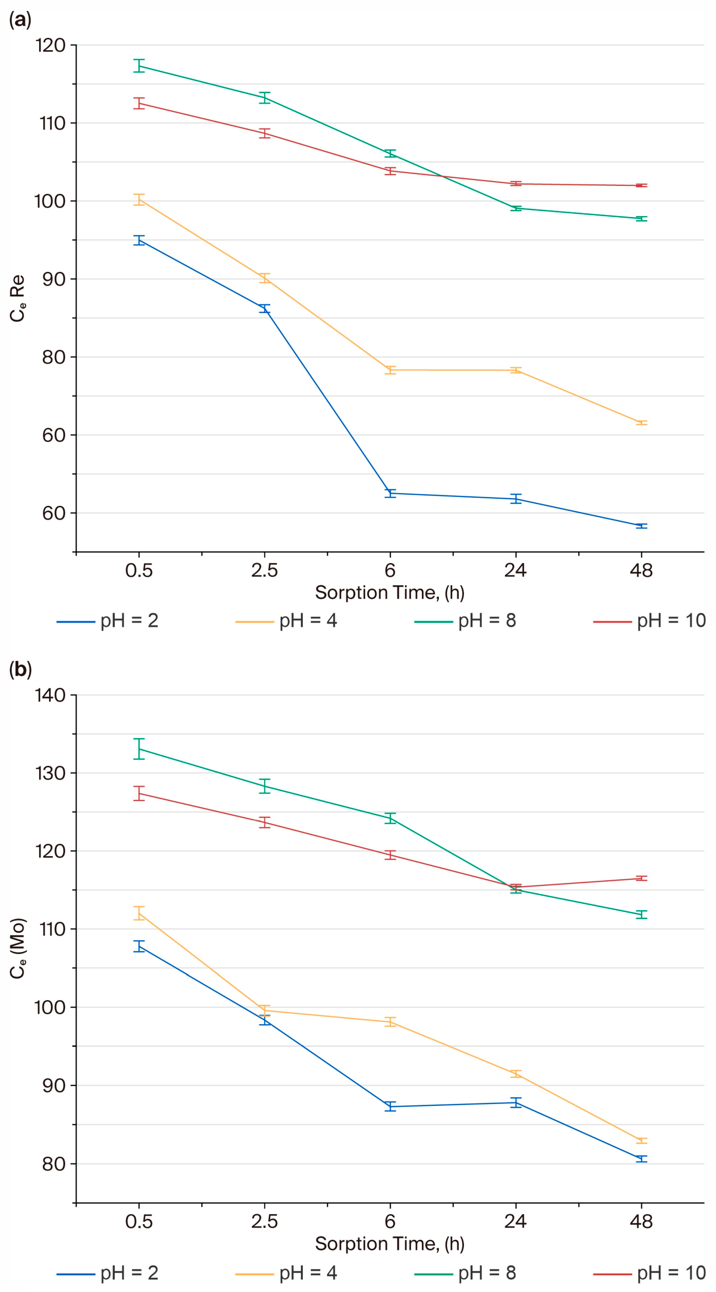 Isotherm experiments were carried out by varying the initial concentrations of rhenium and molybdenum between 10 and 300 mg/L, using a fixed sorbent mass of 0.10 g and a solution volume of 1000 mL. The systems were allowed to equilibrate for 48 h, after which the residual concentrations were measured using ICP-AES.