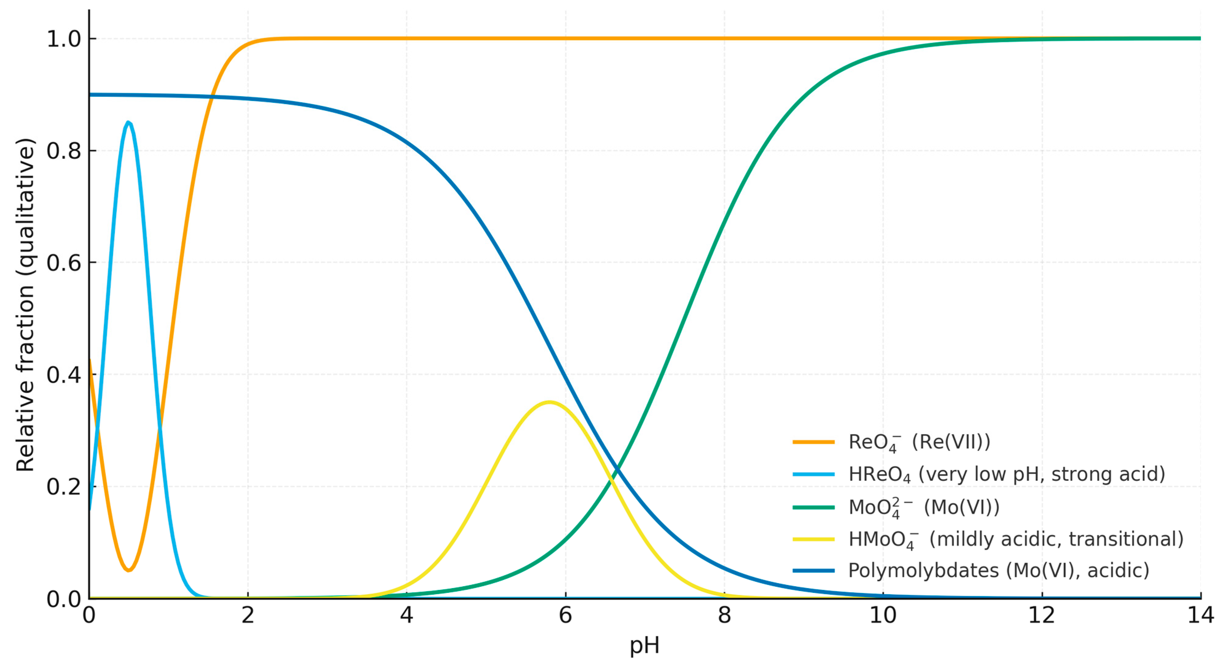 Figure 10. Speciation diagram of rhenium and molybdenum oxyanions in aqueous solution as a function of pH, indicating the dominant forms of Re(VII) and Mo(VI).