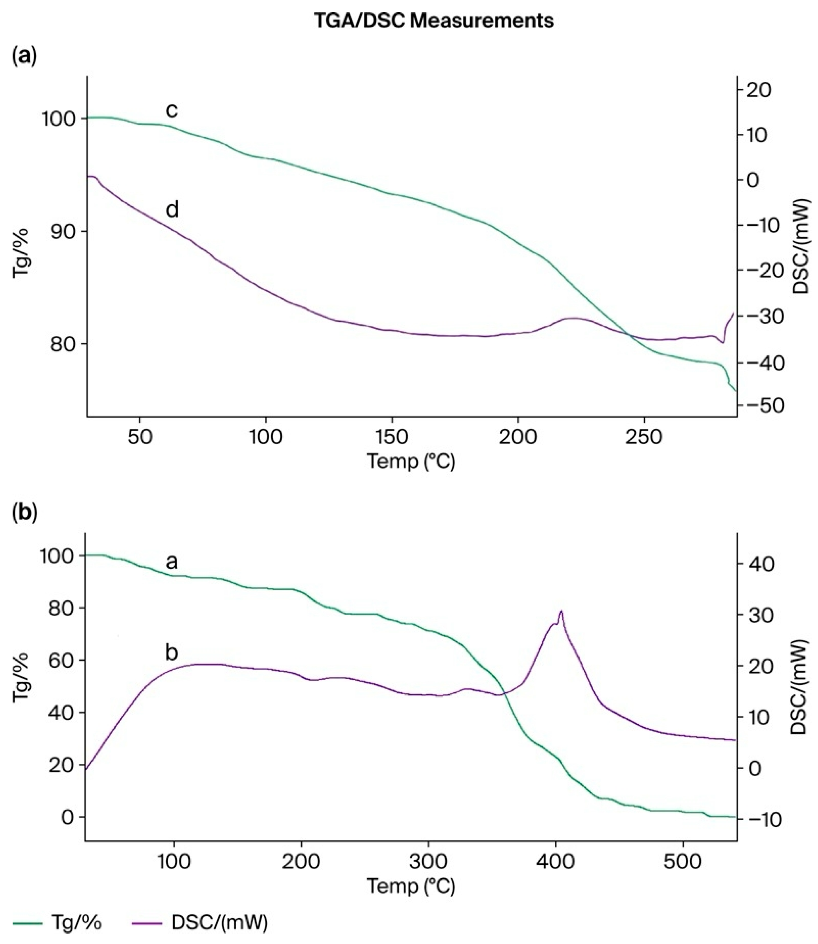 Figure 15. TGA and DSC curves for (a) pristine P4VP/ECH gel and (b) P4VP/ECH gel from the PMAA–P4VP (3:3) interpolymer system after sorption of rhenium and molybdenum ions. (a) Before sorption: curve c (green)—thermogravimetric (TGA) profile showing the mass loss (%) as a function of temperature. curve d (purple)—differential scanning calorimetry (DSC) curve showing the heat-flow variation (mW) with temperature. (b) After sorption: curve a (green)—TGA profile after metal ion sorption, illustrating a delayed onset of decomposition and improved thermal stability. Curve b (purple)—DSC curve demonstrating the thermal effects associated with complex formation and coordination of Re(VII) and Mo(VI) ions.