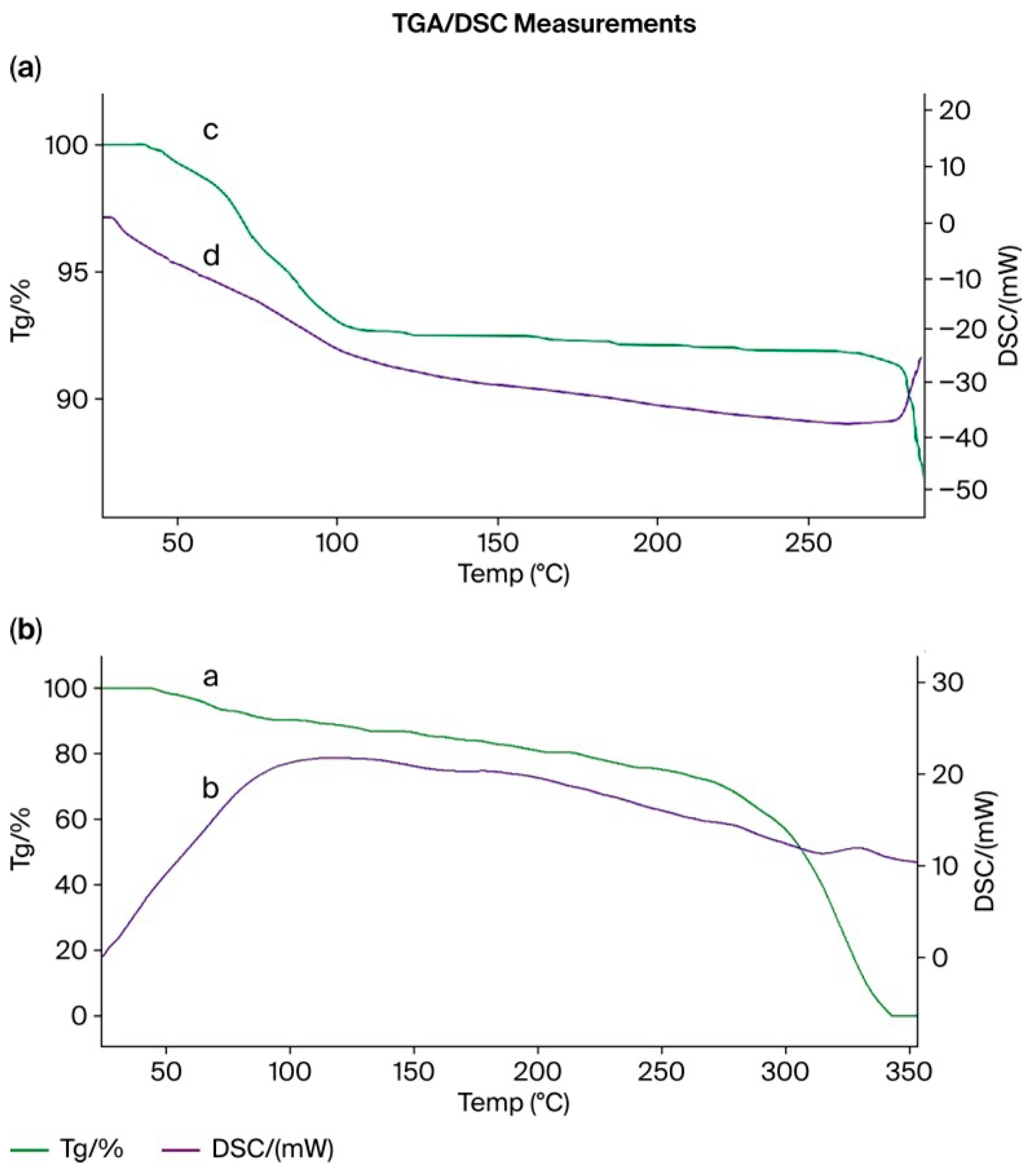 Figure 14. TGA and DSC curves for (a) pristine PMAA and (b) PMAA from the PMAA–P4VP (3:3) interpolymer system after sorption of rhenium and molybdenum ions. (a) Before sorption: curve c (green)—thermogravimetric (TGA) profile showing the mass loss (%) as a function of temperature; curve d (purple)—differential scanning calorimetry (DSC) curve showing the heat-flow changes (mW) during heating. (b) After sorption: curve a (green)—TGA profile after metal uptake; curve b (purple)—DSC curve showing the modified thermal response of the polymer complex.