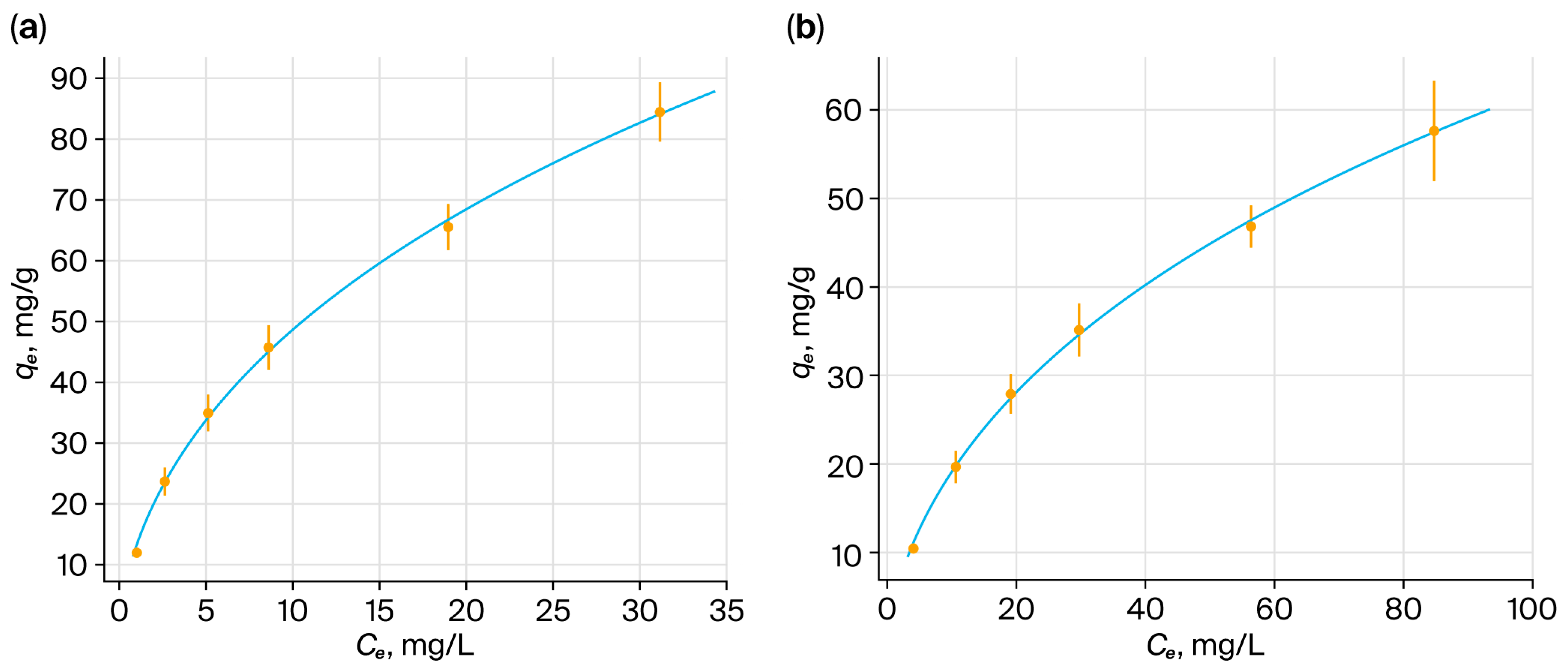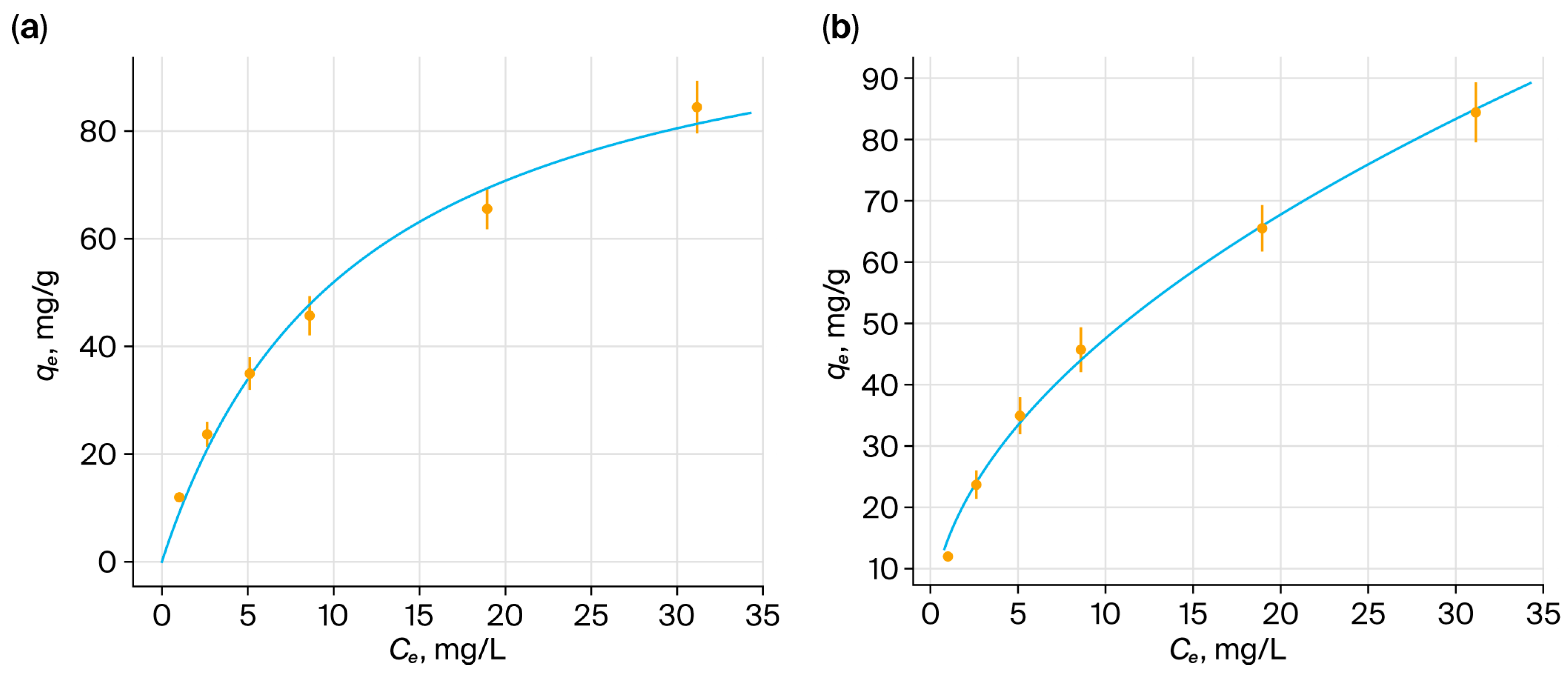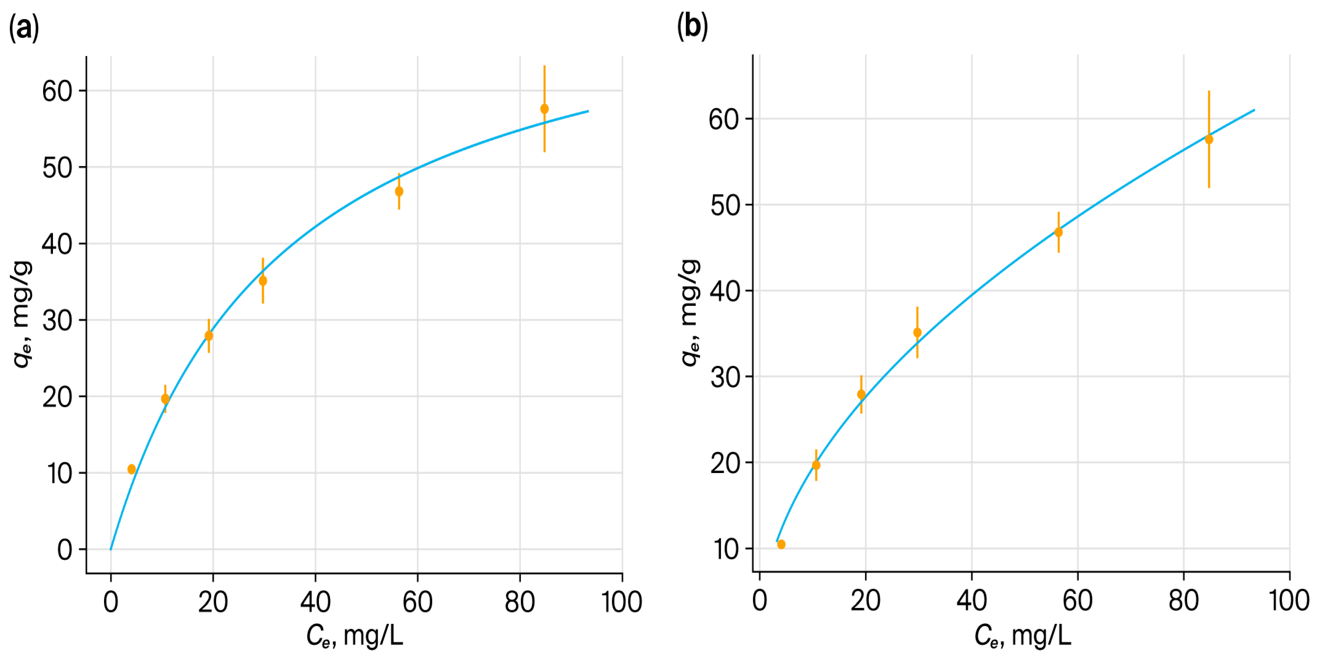 Figure 17. Nonlinear (a) Langmuir and (b) Freundlich adsorption isotherms for Mo(VI) oxyanions sorbed onto PMAA–P4VP (2:3) interpolymer systems at 298 K. Equilibrium conditions correspond to 48 h contact time verified through preliminary kinetics. Error bars represent the standard deviation (mean ± SD, n = 3), with SD ≤ 2%.