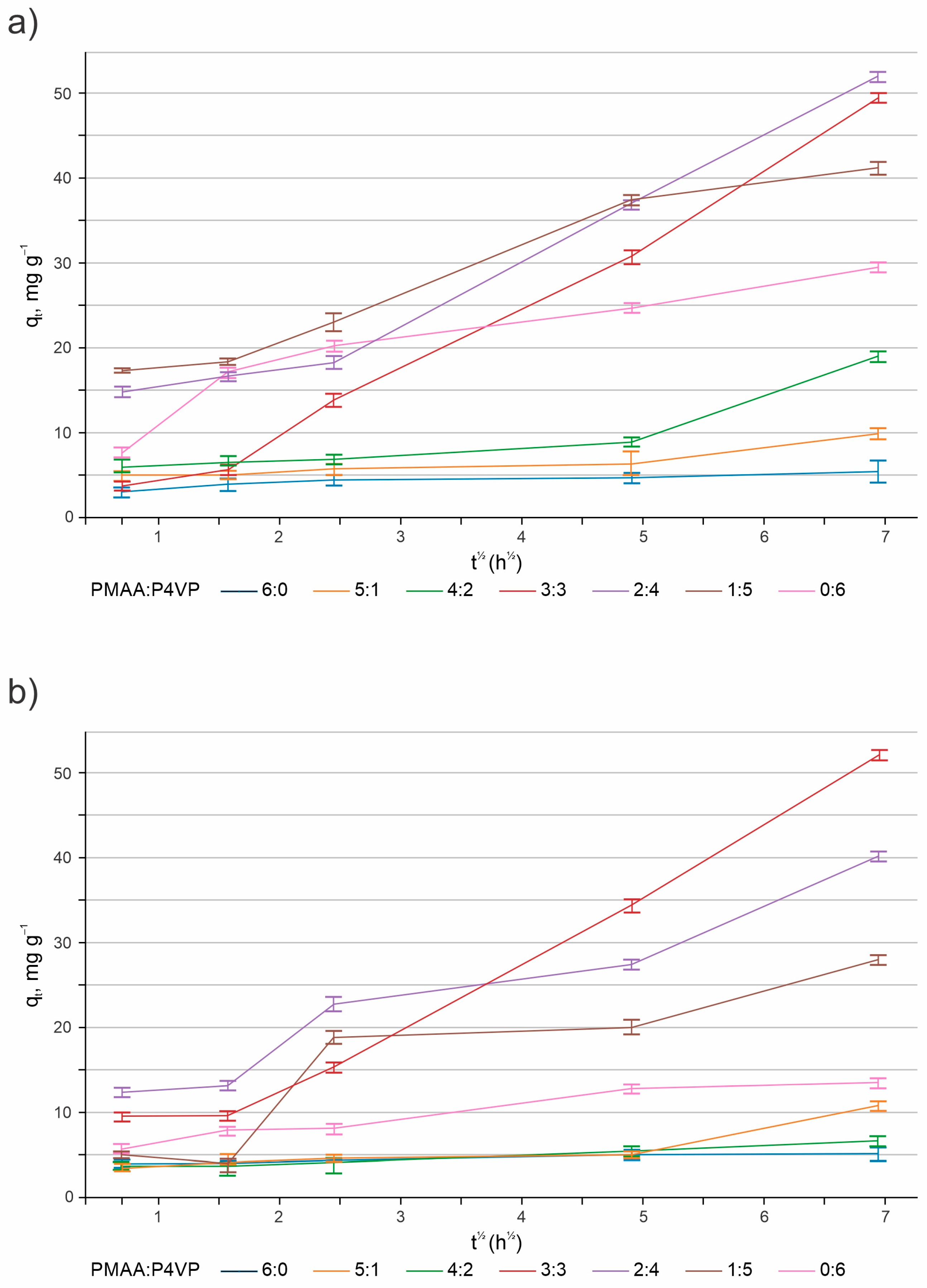 Figure 19. Weber–Morris intraparticle diffusion plots for the sorption of (a) ReO4 and (b) MoO42− ions on PMAA–P4VP interpolymer systems at various molar ratios (6:0, 5:1, 4:2, 3:3, 2:4, 1:5, and 0:6). Error bars represent the standard deviation (mean ± SD, n = 3), with SD ≤ 2%.