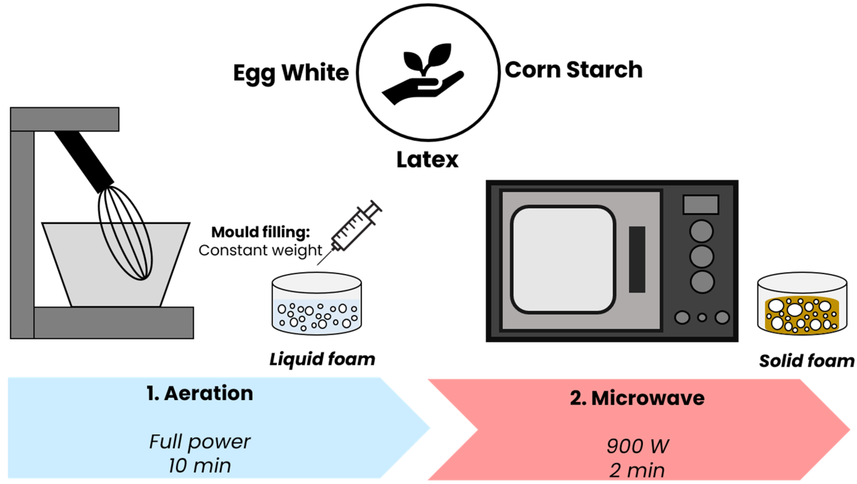 Amezúa-Arranz, C.; Oliveira Salmazo, L.; López-Gil, A.; Rodríguez-Pérez, M.-Á. Effect of Corn Starch as Stabilizer Particle in Combination with Egg White Proteins in Natural Rubber Latex Biofoams Produced by Microwave Foaming. Polymers 2025, 17, 3057. https://doi.org/10.3390/polym17223057