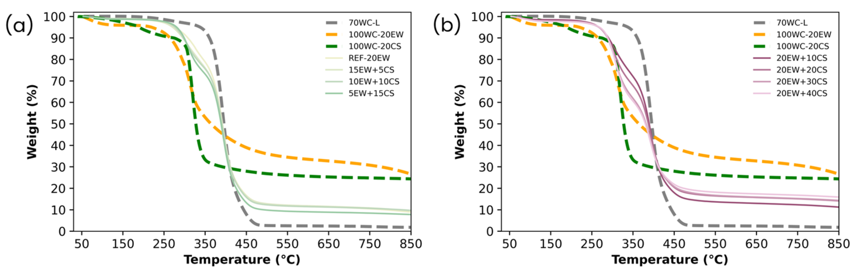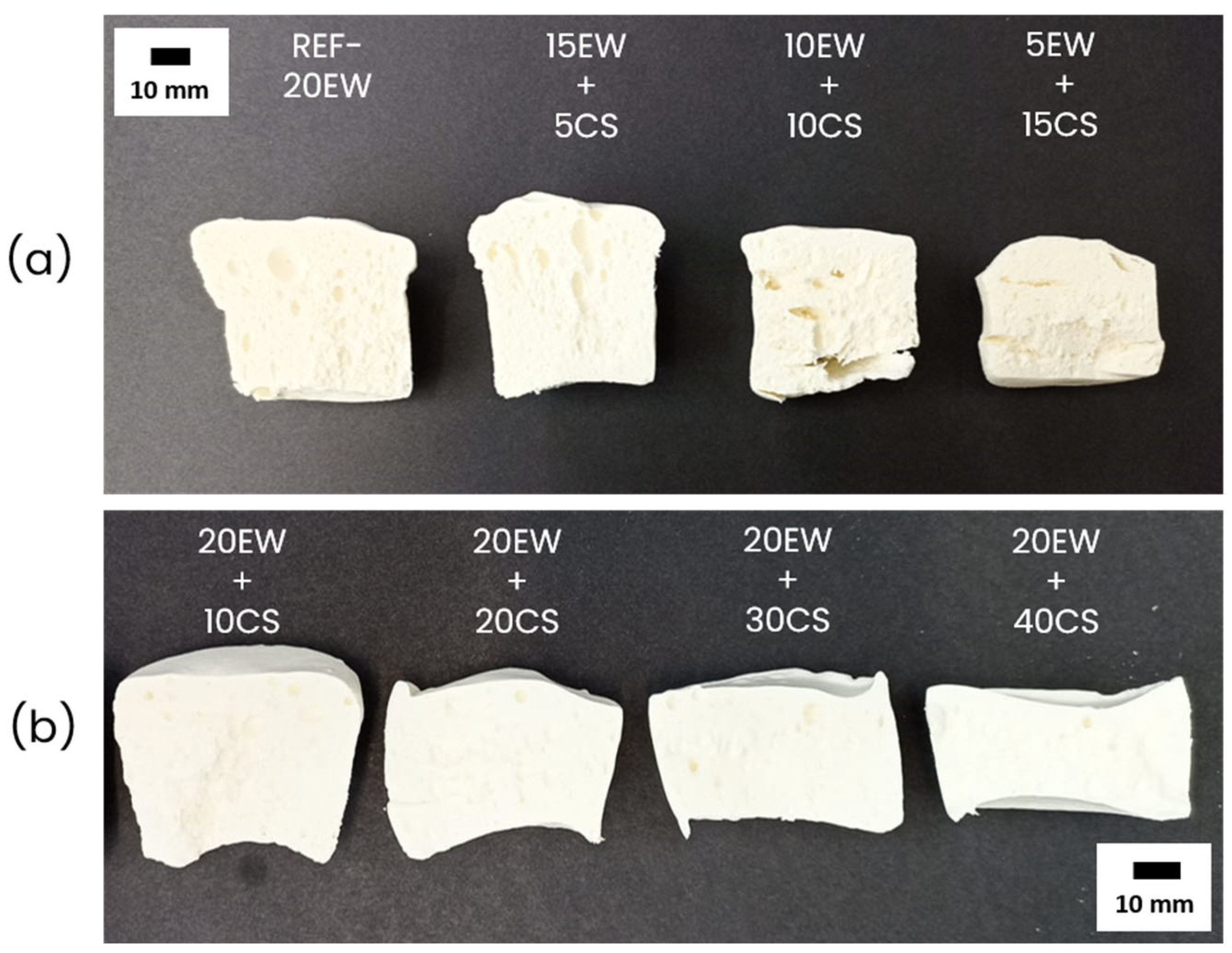 - Luciano, G.; Vignali, A.; Vignolo, M.; Utzeri, R.; Bertini, F.; Iannace, S. Biocomposite Foams with Multimodal Cellular Structures Based on Cork Granulates and Microwave Processed Egg White Proteins. Materials 2023, 16, 3063. [Google Scholar] [CrossRef]
