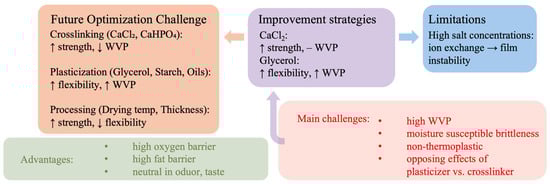 Schematic summary of the main challenges and optimization strategies for alginate-based cast films.