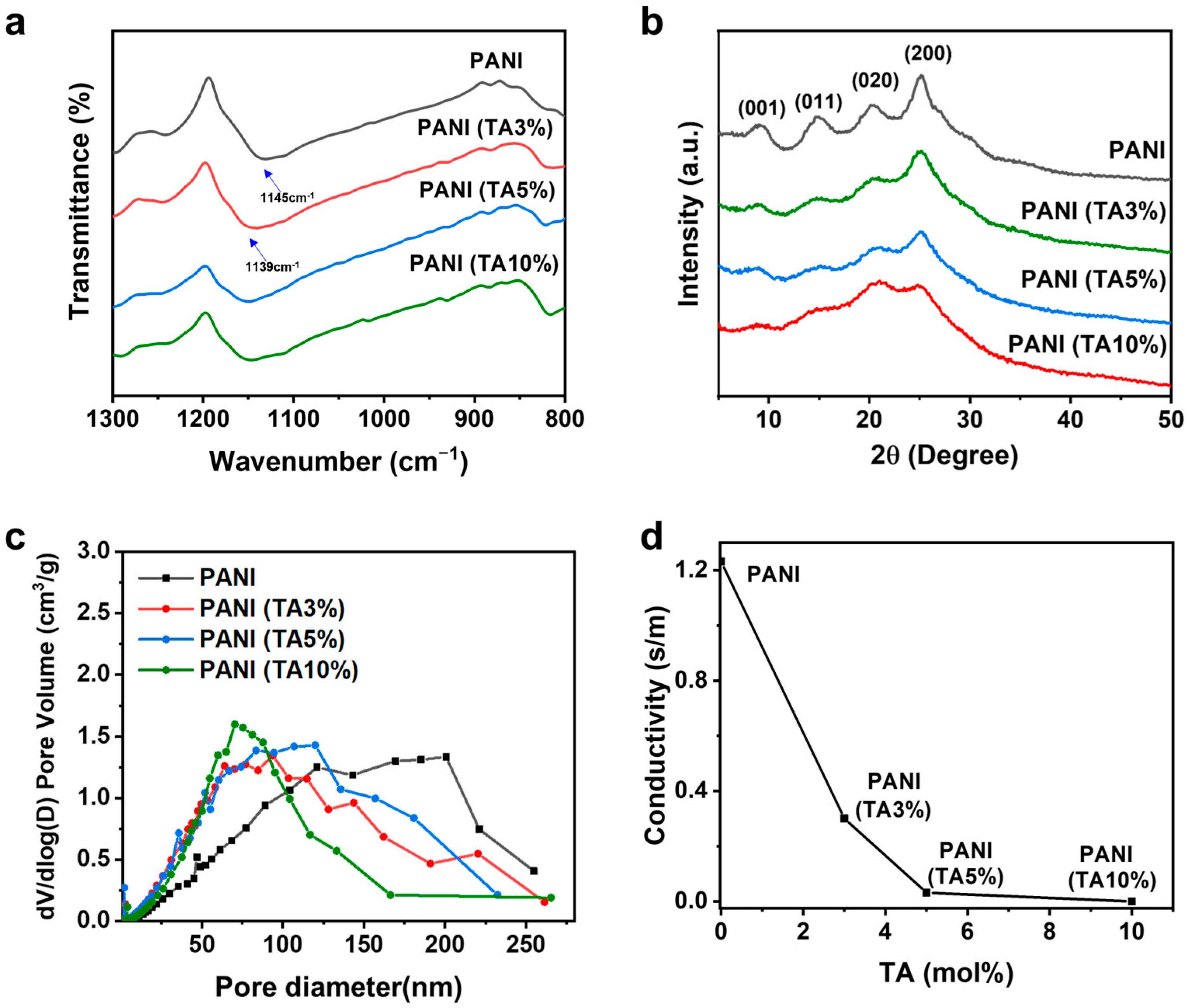 | PANI(TA x%) | Polyaniline from copolymerization of aniline and TA (x mol% relative to aniline) |