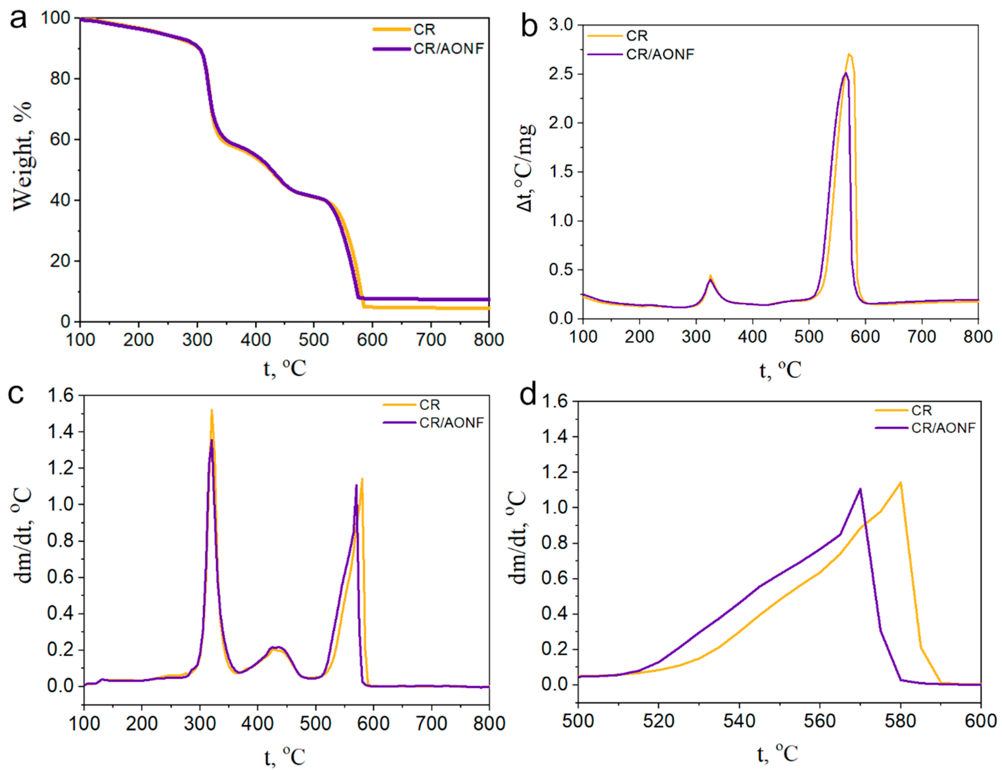 - Denardin, E.L.G.; Samios, D.; Janissek, P.R.; de Souza, G.P. Thermal Degradation of Aged Chloroprene Rubber Studied by Thermogravimetric Analysis. Rubber Chem. Technol. 2001, 74, 622–629. [Google Scholar] [CrossRef]