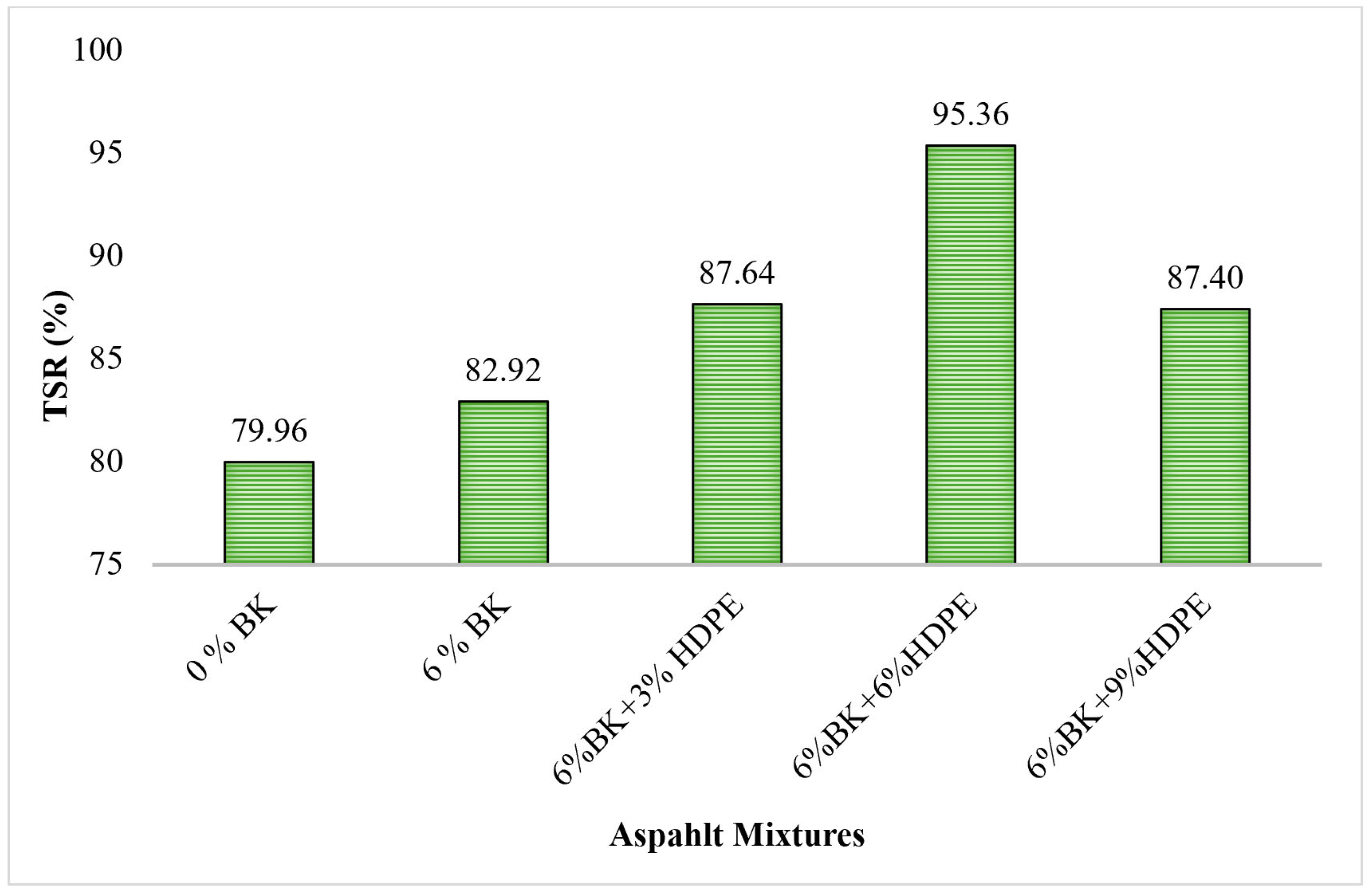 - Polymer modification dramatically improved moisture damage resistance, with the optimal 6%BK + 6%HDPE composition achieving a TSR of 95.36% compared to 79.96% for control mixtures. This represents a critical advancement for Pakistani pavements subjected to monsoon conditions and temperature extremes, potentially extending service life by reducing moisture-induced distress, including stripping and raveling.