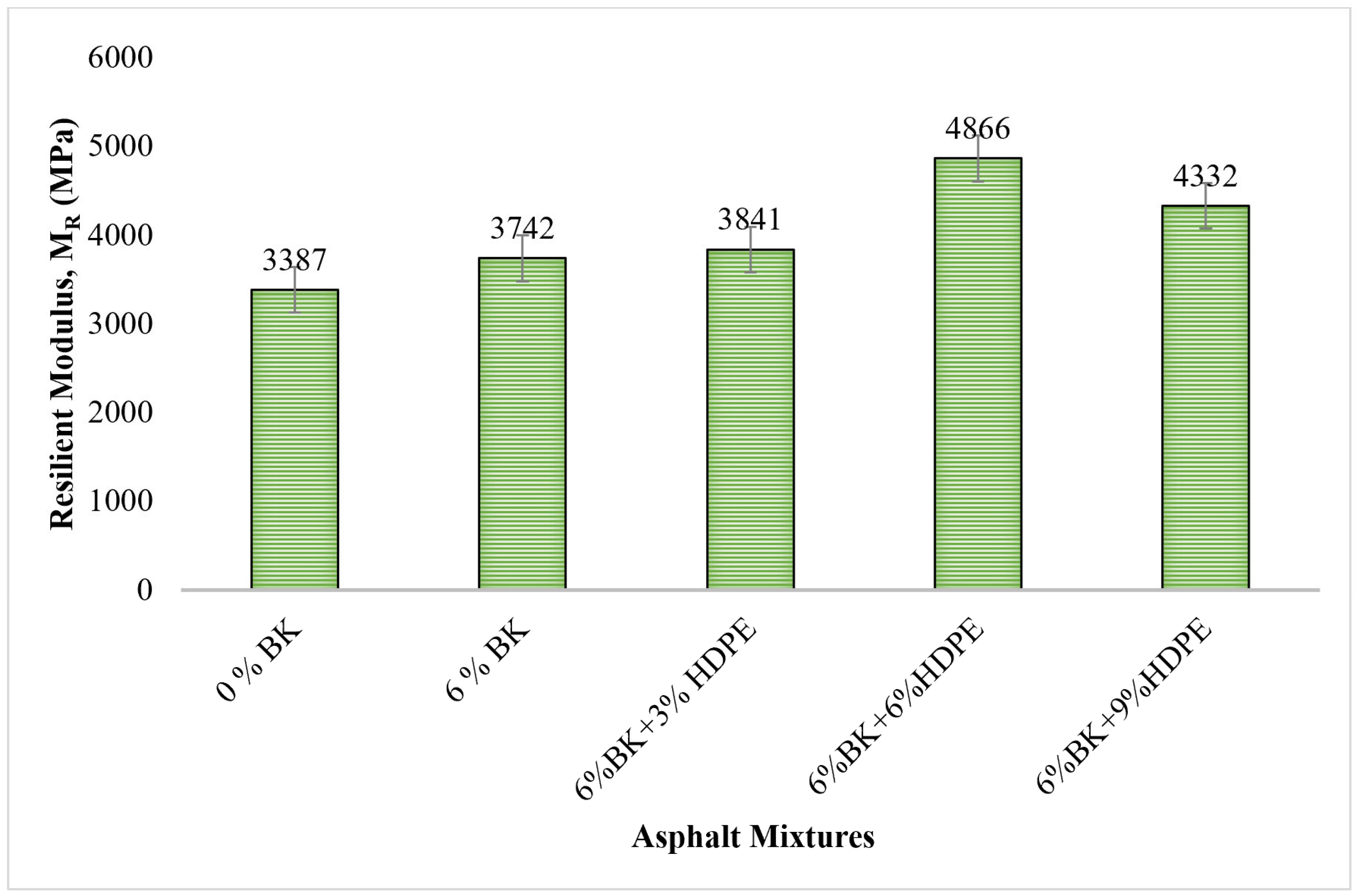 - The 6%BK + 6%HDPE combination emerged as the optimal formulation, demonstrating balanced improvements across all performance parameters. This composition achieved 24.7% improvement in unconditioned ITS, 48.7% improvement in conditioned ITS, 95.36% TSR (exceeding AASHTO T283 requirements by 19%), 43.7% enhancement in resilient modulus, and 27.4% reduction in rutting depth compared to control mixtures.