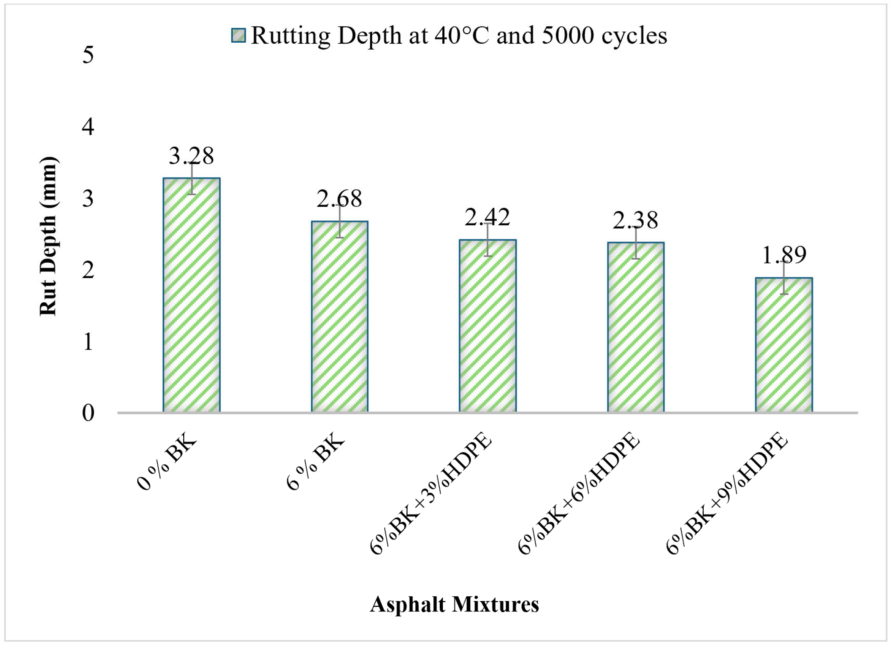 - The modified mixtures demonstrated superior performance at elevated temperatures (40 °C HWTT) while maintaining adequate low-temperature properties. The 6%BK + 6%HDPE formulation reduced rutting depth by 27.4%, addressing the primary distress mechanism in Pakistan’s hot climate regions where summer temperatures regularly exceed 45 °C.