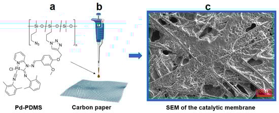 First, we checked the solubility of Pd-PDMS. As before, Pd-PDMS is soluble in CHCl3 and CH2Cl2 but insoluble in alcohols. Second, we confirmed the unchanged structure of Pd-PDMS by 1H NMR spectroscopy. The 1H NMR spectra of freshly prepared Pd-PDMS and the same sample stored for one year are presented in Figure S4. Third, for catalytic membrane preparation, Pd-PDMS was dissolved in CH2Cl2 to provide quick solvent evaporation from the carbon support, the solution was drop-cast on CP, and the paper was dried at 50 °C for 1 h. The scheme of catalytic membrane preparation is given in Figure 1. A scanning electron microscopy (SEM) image of the obtained catalytic membrane is also shown in Figure 1.