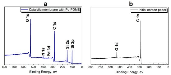 The presence of Pd-PDMS on the carbon support was confirmed by XPS. XPS survey spectra of the catalytic membrane with Pd-PDMS and the initial CP are presented in Figure 2. XPS core level spectra of Si 2p and Pd 3d are given in Figure S7.