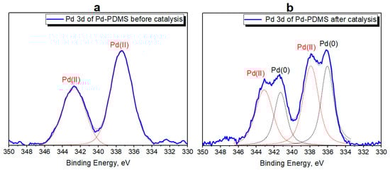 In order to evaluate the changes in Pd-catalytic sites of Pd-PDMS, we acquired Pd 3d core level spectra before and after catalysis. As an example, the Suzuki reaction was chosen. Deconvolution of Pd 3d core level spectra for Pd-PDMS-containing catalytic membrane was performed in accordance with refs. [42,43] (Figure 3). Background subtraction was carried out using the Tougaard method. The XPS peaks usually demonstrate Lorentzian contour, but the presence of instrumental and other factors leads to a Gaussian contribution. Thus, the mixed Gaussian–Lorentzian function was used for the Pd 3d core level fitting [44].