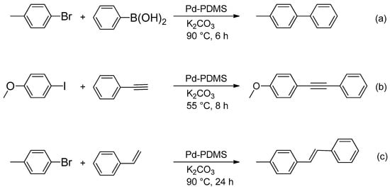 Reactions catalyzed by the Pd-PDMS catalytic membrane: Suzuki coupling (a), Sonogashira coupling (b), Heck coupling (c).