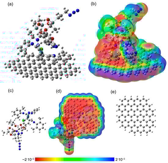 To estimate local interaction of Pd-PDMS and the surface of carbon fibers of carbon paper, DFT calculations were performed. As a model compound simulating a part of the carbon fiber surface, polyaromatic hydrocarbon (PAH) with 27 planar hexagonal rings was chosen. Similar approaches were used in previous studies, where dimers and trimers of polycyclic aromatic hydrocarbons were used as models of graphene bilayers and trilayers [52] as well as to model interaction with multi-walled carbon nanotubes outer layer [53]. The optimized geometry of Pd-PDMS complex coordinated to PAH with corresponding electrostatic potential (ESP) maps is depicted in Figure 5.