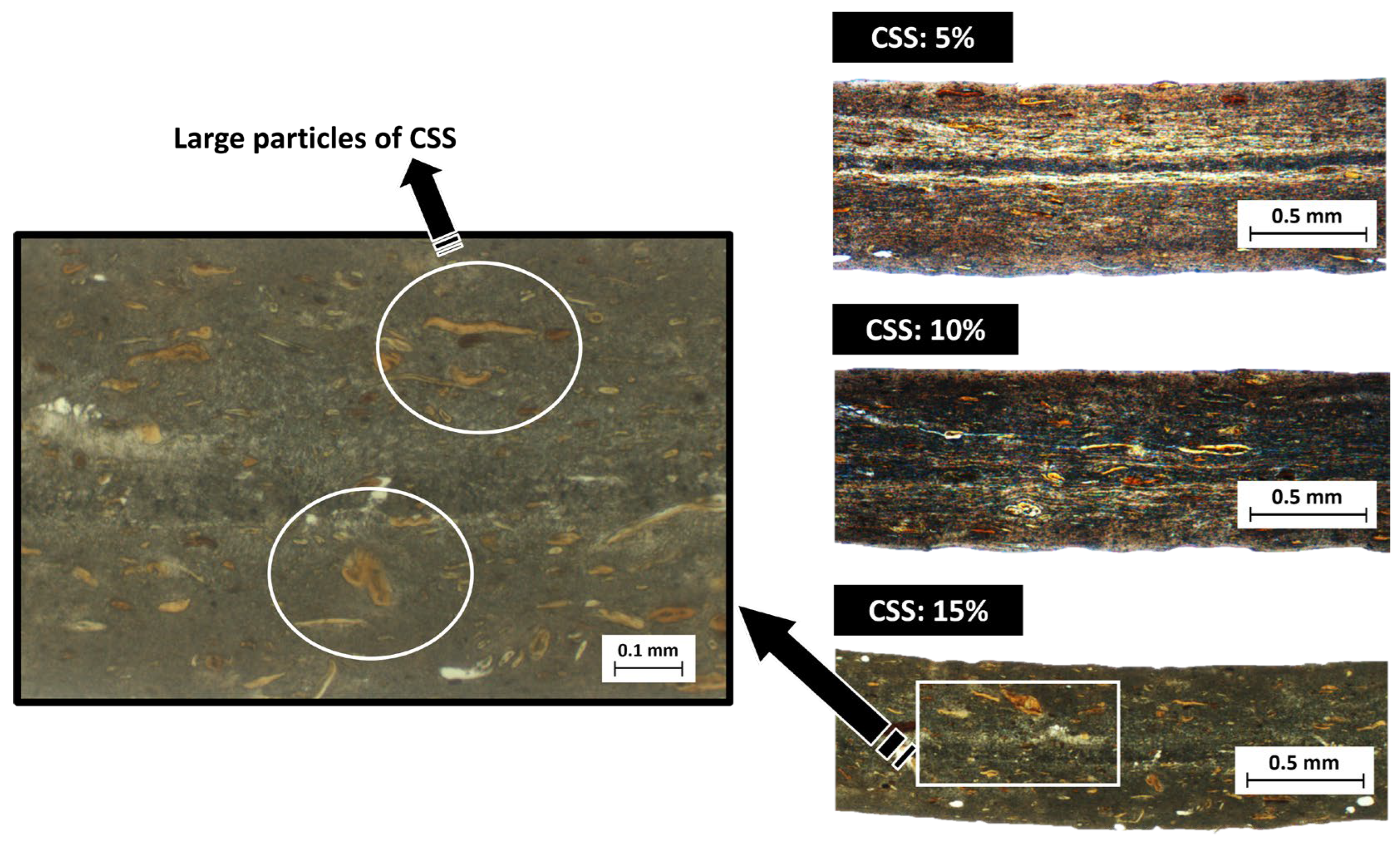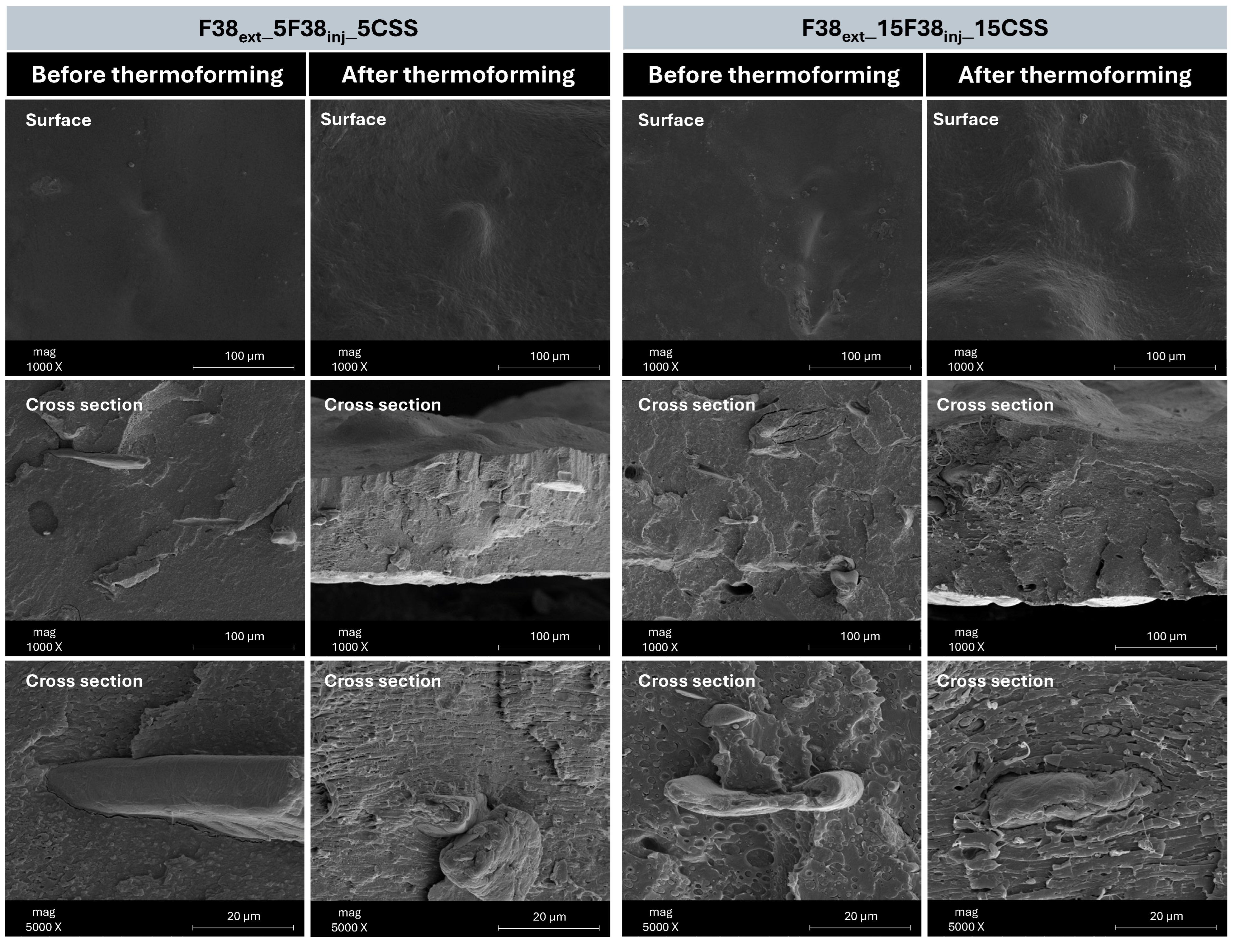 - SEM observations confirmed the presence of CSS particles within the PLA matrices. The polymer fibres appeared well interwoven and relatively uniform. Compared to the neat polymer, the addition of the filler tends to moderate the blend fluidity while maintaining sufficient deformation resistance, making it possible to thermoform all compositions.
