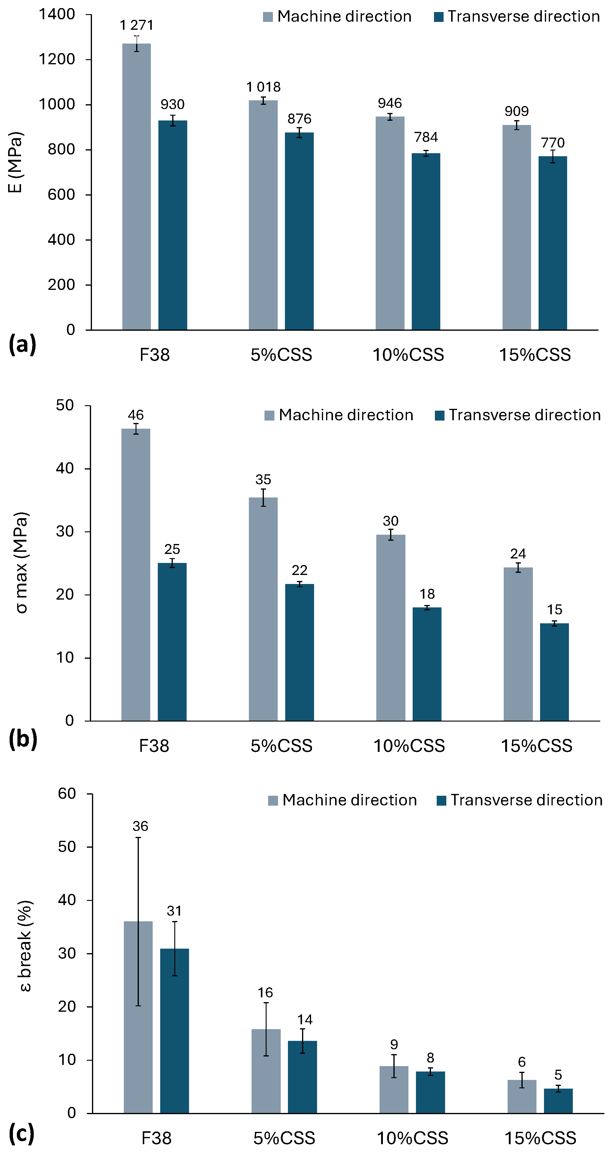 - In all the resulting biopolymer blends, the elastic modulus, tensile strength, and elongation at break were all reduced. This behaviour is likely due to factors such as the irregular particle size of the filler, the absence of a compatibilizer agent, and differences in chemical structures and polarity between the filler and the polymer matrix.