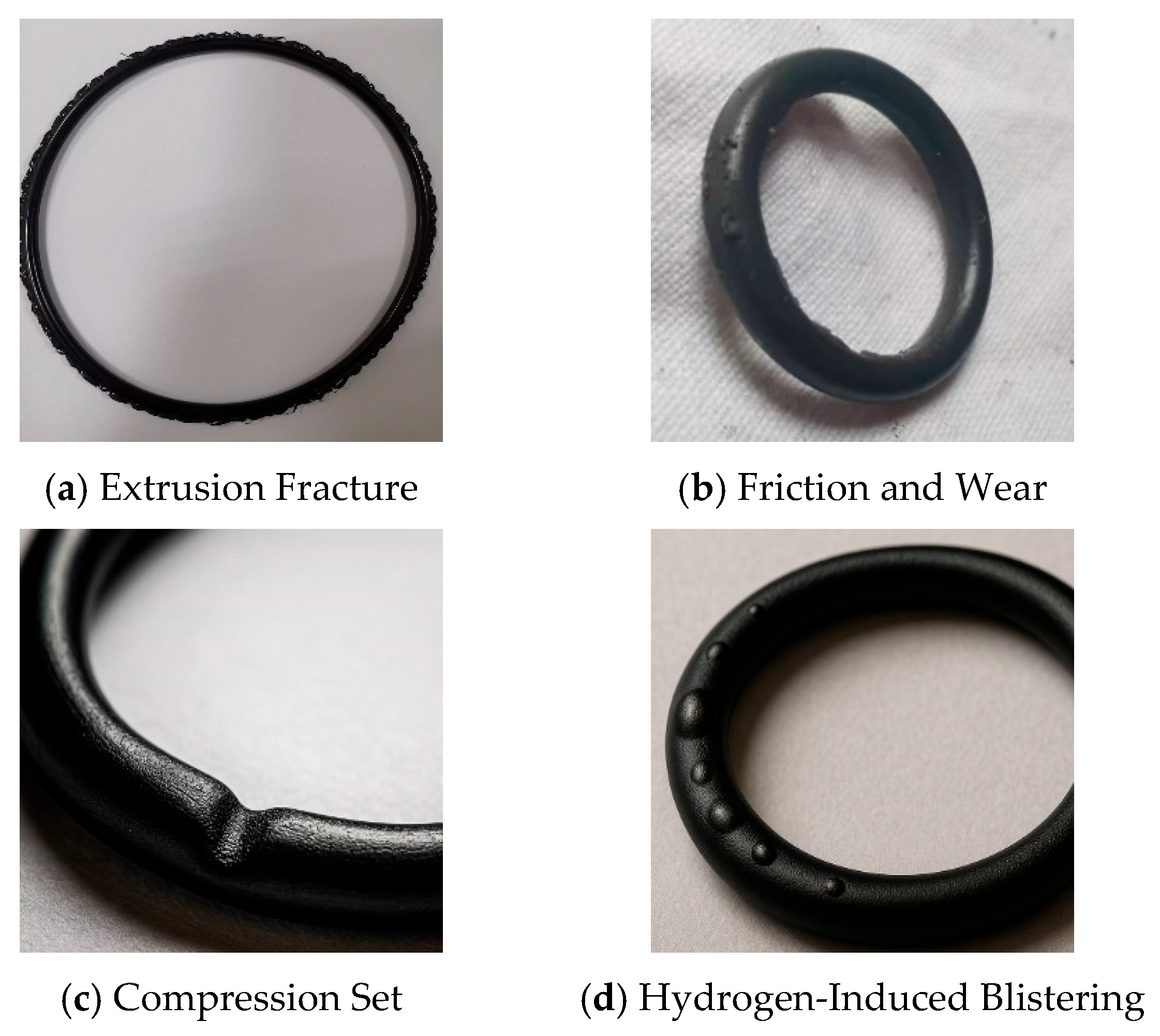- Chen, Q.; Yang, M.; Peng, W.; Yao, R.; Shi, J. Review on Hydrogen-Induced Failure of Rubber O-Rings for High Pressure Hydrogen Storage Tanks. In Proceedings of the ASME Pressure Vessels and Piping Conference, Atlanta, GA, USA, 16–21 July 2023; ASME: New York, NY, USA, 2023. Paper No. V002T03A014. [Google Scholar] [CrossRef]