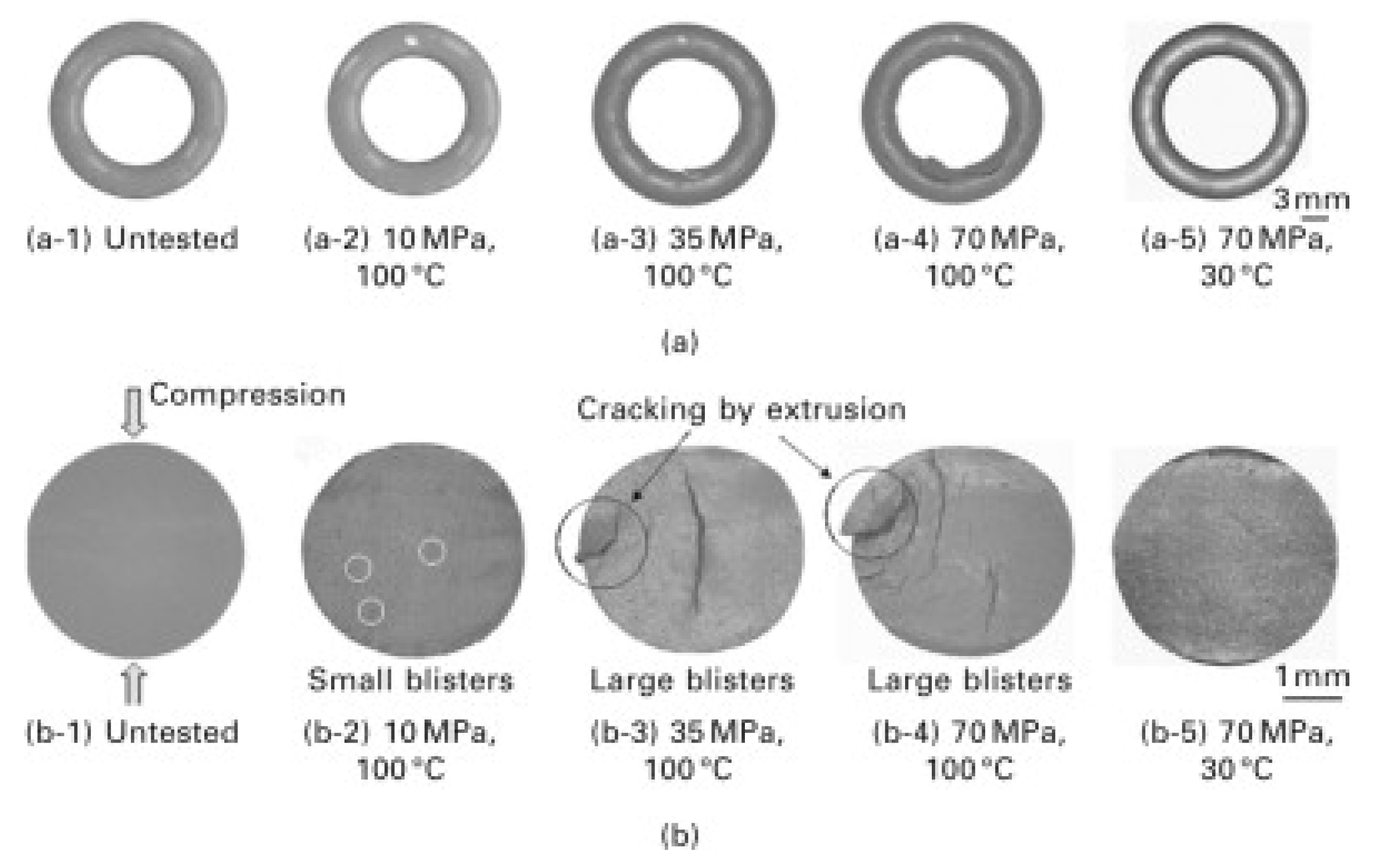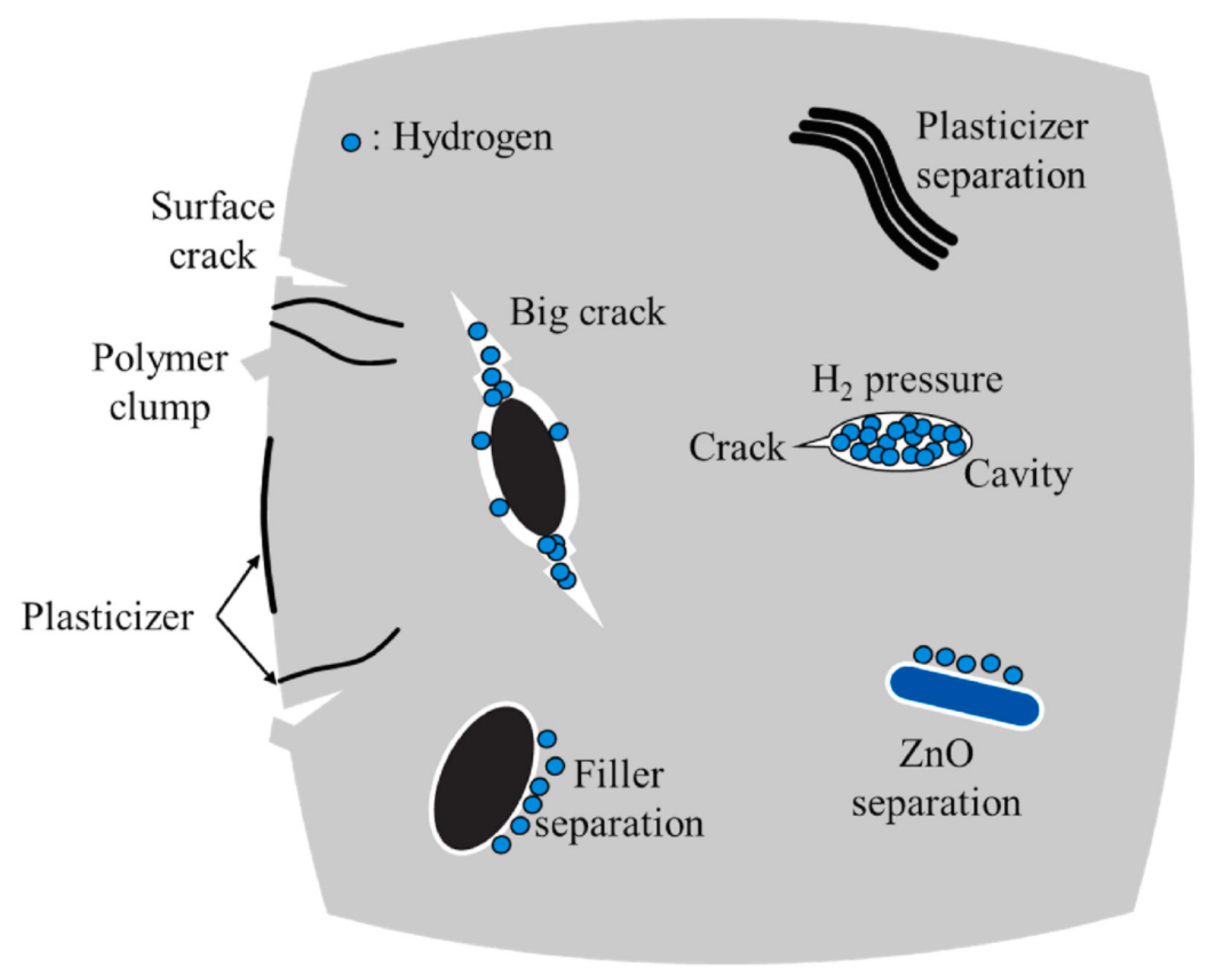 - Zhou, C.; Zheng, Y.; Hua, Z.; Mou, W.; Liu, X. Recent Insights into Hydrogen-Induced Blister Fracture of Rubber Sealing Materials: An In-Depth Examination. Polym. Degrad. Stabil. 2024, 224, 110747. [Google Scholar] [CrossRef]