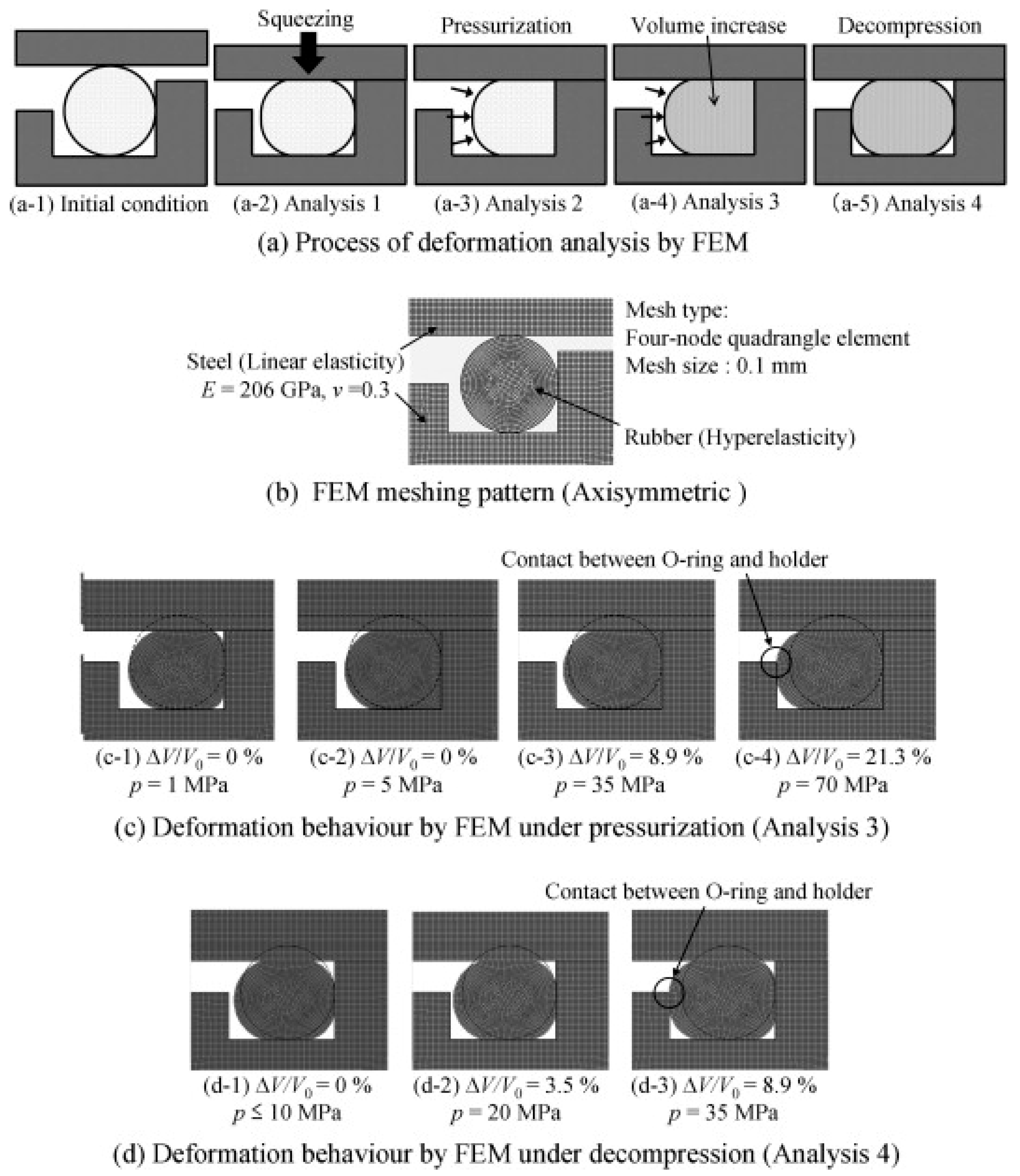 - Li, J.X.; Liu, P.F.; Wang, S.B.; Leng, J.X. Finite Element Analysis of O-Ring Sealing Performance of Manned Submersible Viewports. J. Fail. Anal. Prev. 2020, 20, 1628–1637. [Google Scholar] [CrossRef]